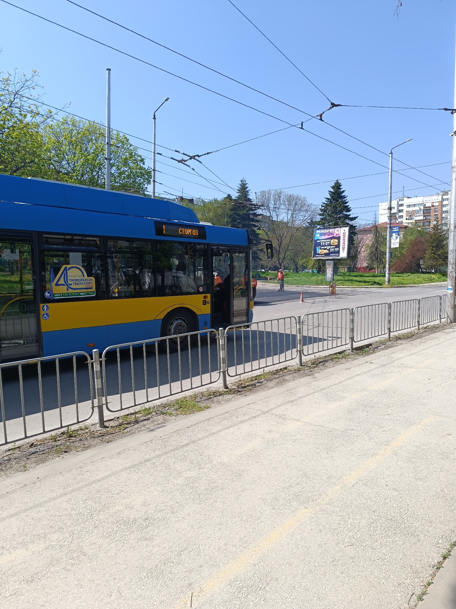 A brightly lit outdoor photograph captures an urban street scene in Pleven, Bulgaria, under a clear blue sky on a sunny day. The primary subject is a blue and yellow trolleybus, which is stationary, p…read more