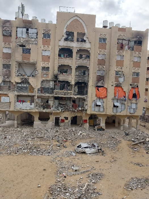 This image depicts a scene of widespread destruction in Khan Yunis, Palestinian Territory, under an overcast sky. The focal point is a multi-story residential building, light-tan in color, exhibiting…read more