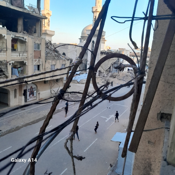 An elevated view captures a street scene in Khan Yunis, Palestinian Territory, characterized by extensive structural damage. In the immediate foreground, rusted metal bars and multiple dark electrical…read more