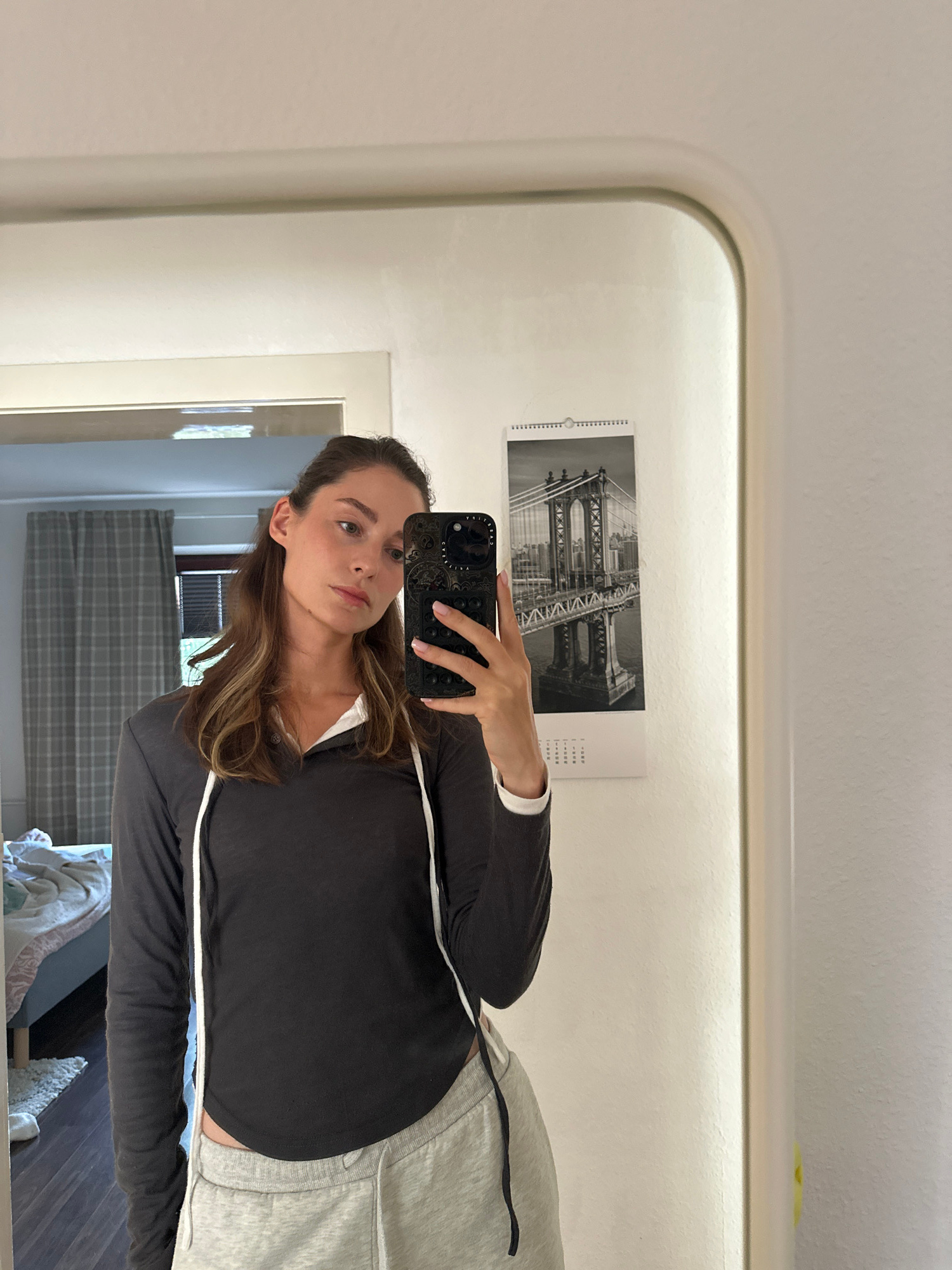 A woman is taking a selfie in a mirror. She is wearing a dark-colored long-sleeved top with white trim and light gray sweatpants. She is holding a black smartphone. A black-and-white photograph or pri…read more