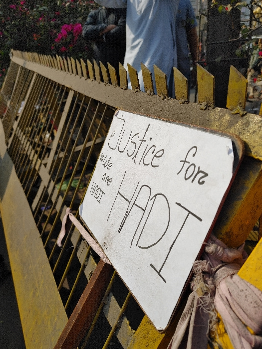 The image displays a white rectangular protest sign affixed to a yellow metal barrier in a daylight outdoor setting, identified as Dhaka, Bangladesh, although the specific location within the city is…read more