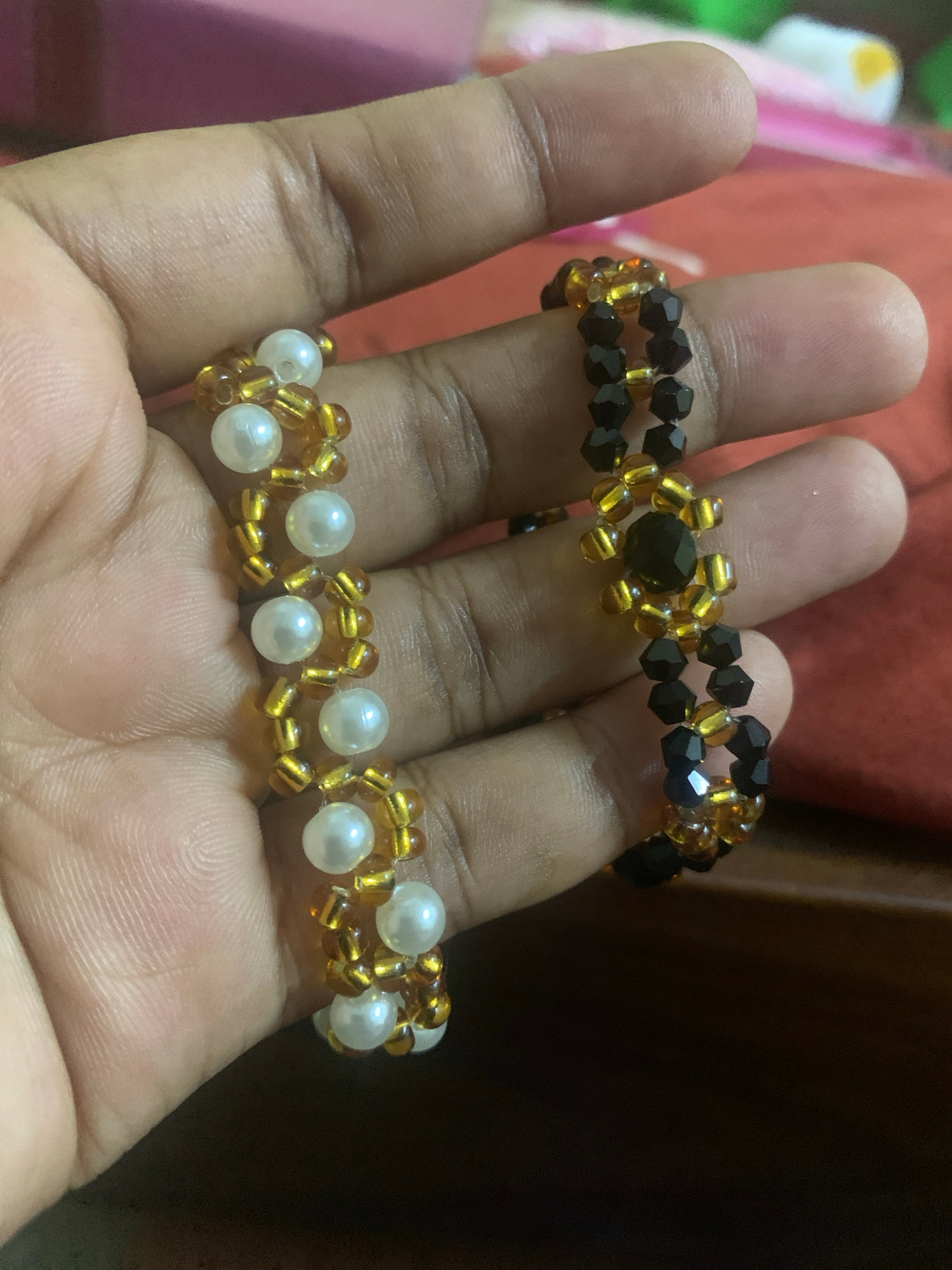 A hand is holding two beaded rings. The ring on the forefinger consists of black beads and gold-colored seed beads. The ring on the middle finger consists of faux pearls and gold-colored seed beads. T…read more
