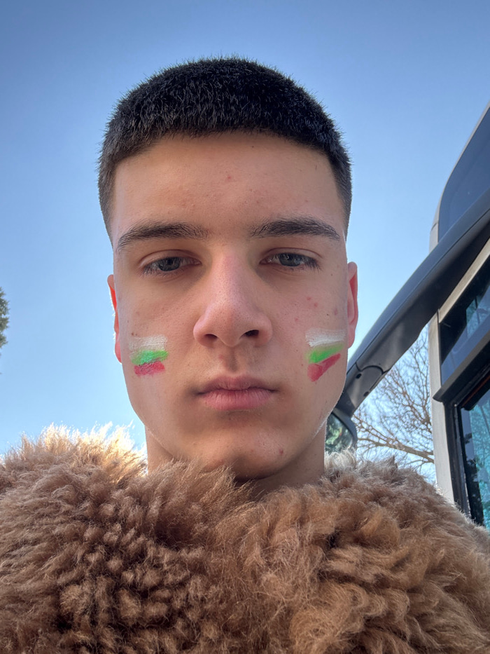 A close-up, head-and-shoulders portrait depicts a young Caucasian male, approximately 18-25 years old, situated outdoors in Yambol, Bulgaria, under a clear daylight sky. The subject has short, dark, c…read more