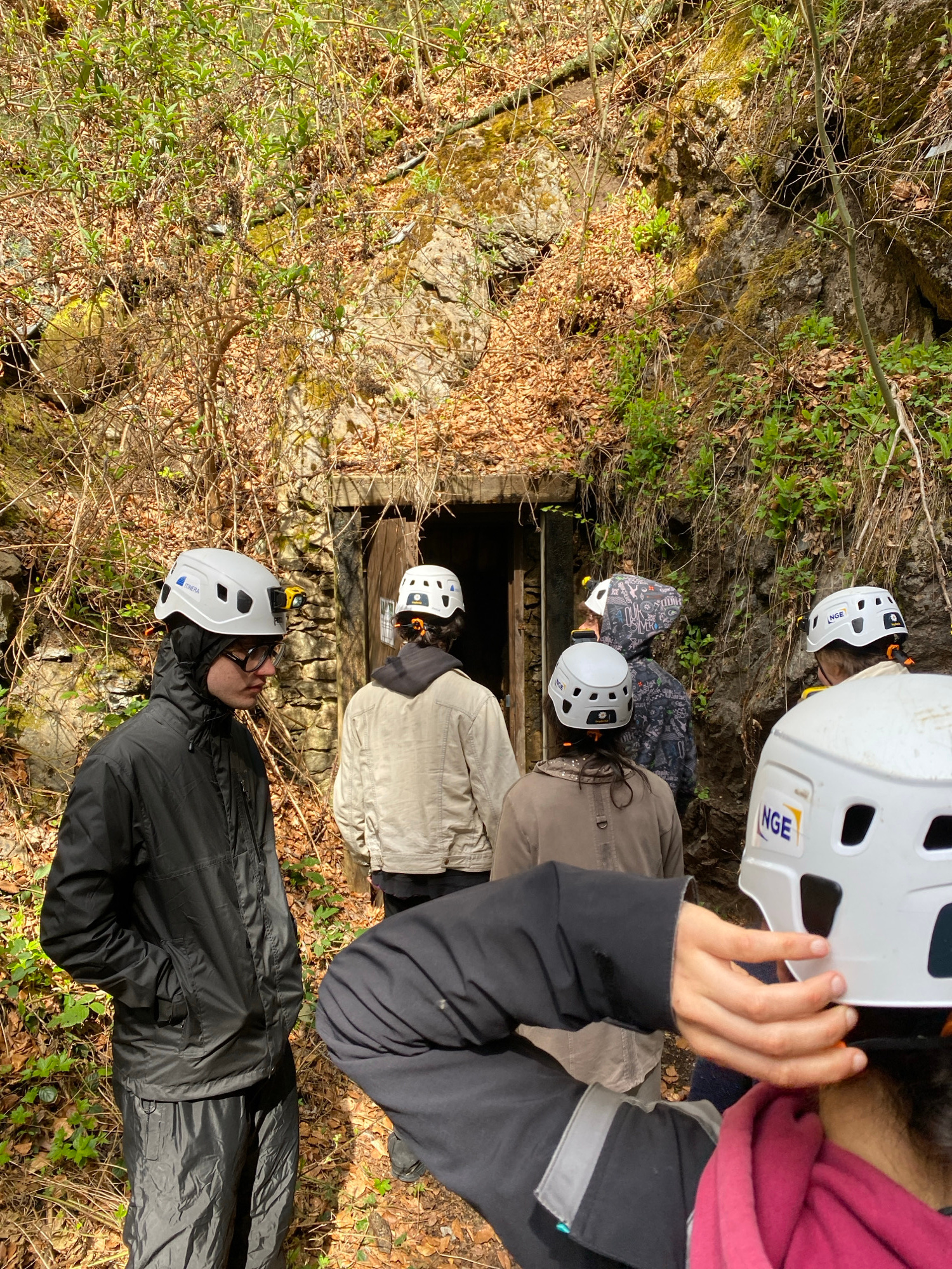 A group of individuals, at least seven, are gathered around a dark, rectangular opening in a rocky, vegetation-covered hillside. The opening appears to be a mine or cave entrance, possibly reinforced…read more