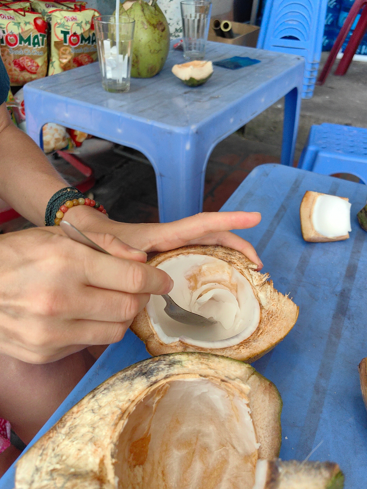 A close-up shot shows a person scooping the inside of a coconut with a spoon on a blue plastic table. Another half of the coconut sits below, already scraped clean. A piece of the coconut and its pulp…read more