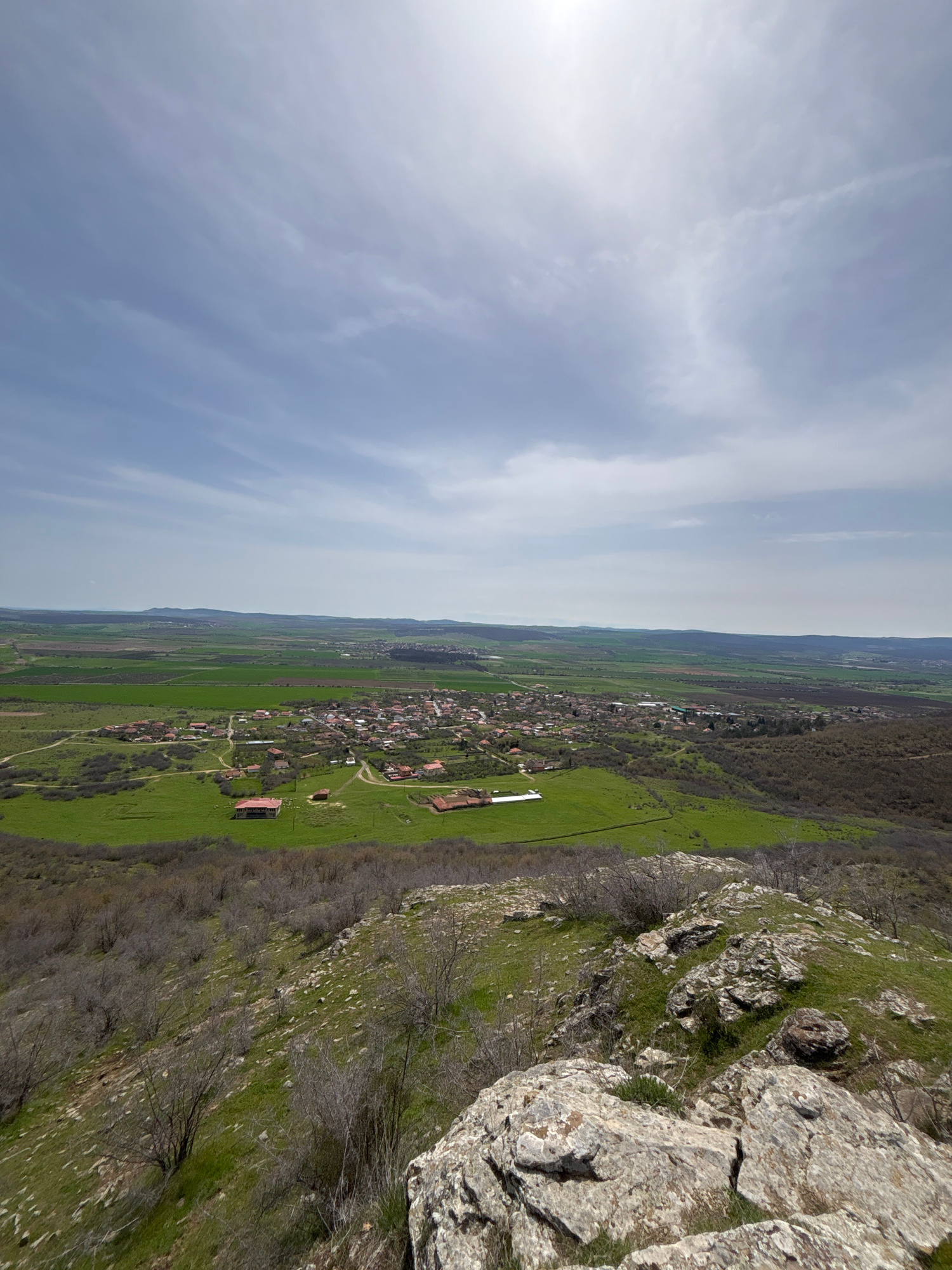 The image captures a landscape view in Goritsa, Bulgaria, showcasing a blend of natural and human elements. On the right side, a rocky terrain with sparse vegetation leads down to a green, grassy area…read more