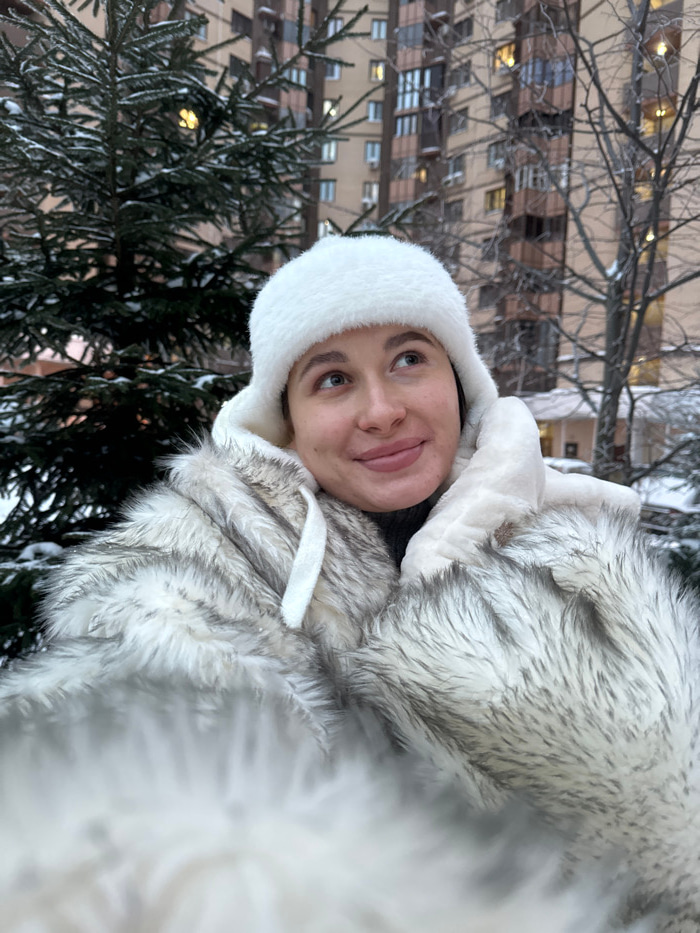 A female subject is depicted outdoors in a close-up, chest-up portrait during a winter setting. She wears a white, fluffy ear-flap hat and a grey and white patterned faux fur coat, with a dark grey co…read more