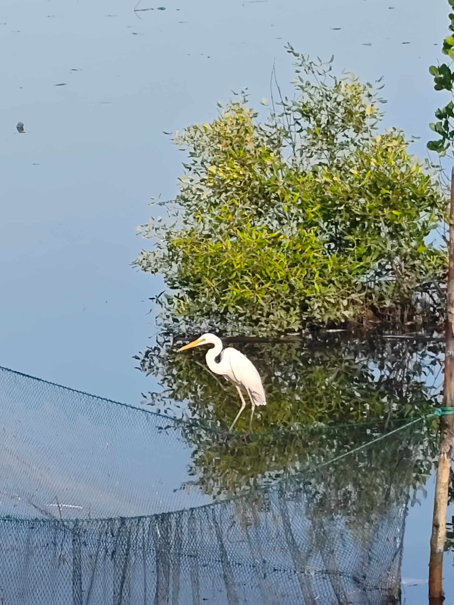 A white egret stands on a net in the water, positioned near a tree. The tree and the egret are reflected in the water. This photo was taken in the city of Lhokseumawe, Indonesia.