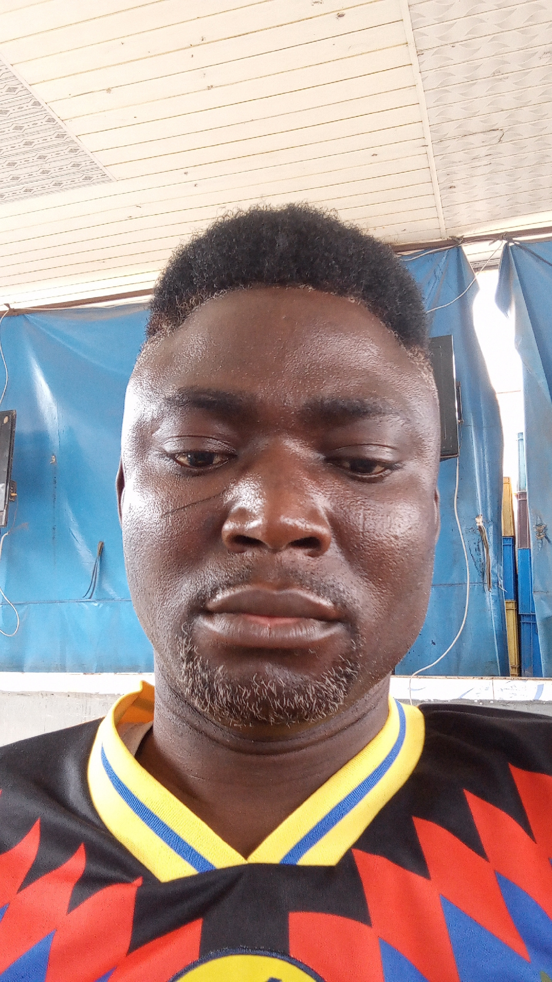 A medium shot captures a man with dark skin and short, curly hair, likely in Sabon Tasha, Nigeria, based on the request. He has a short, graying beard and a scar near his left eye. The man wears a bla…read more