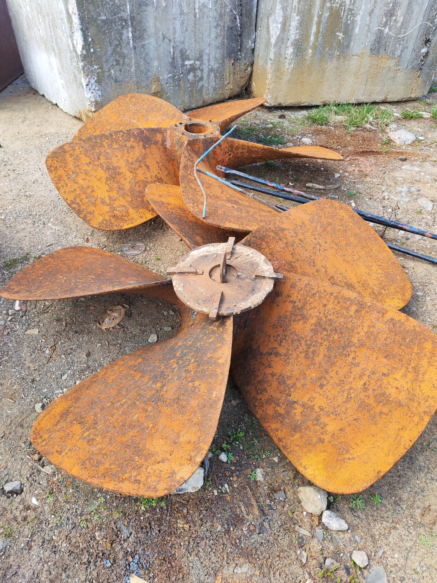 The image shows two large, rusty, multi-bladed impellers lying on a dirt and gravel surface. The impellers are orange with heavy rust pitting. One impeller has seven blades, and the other has five. Bl…read more