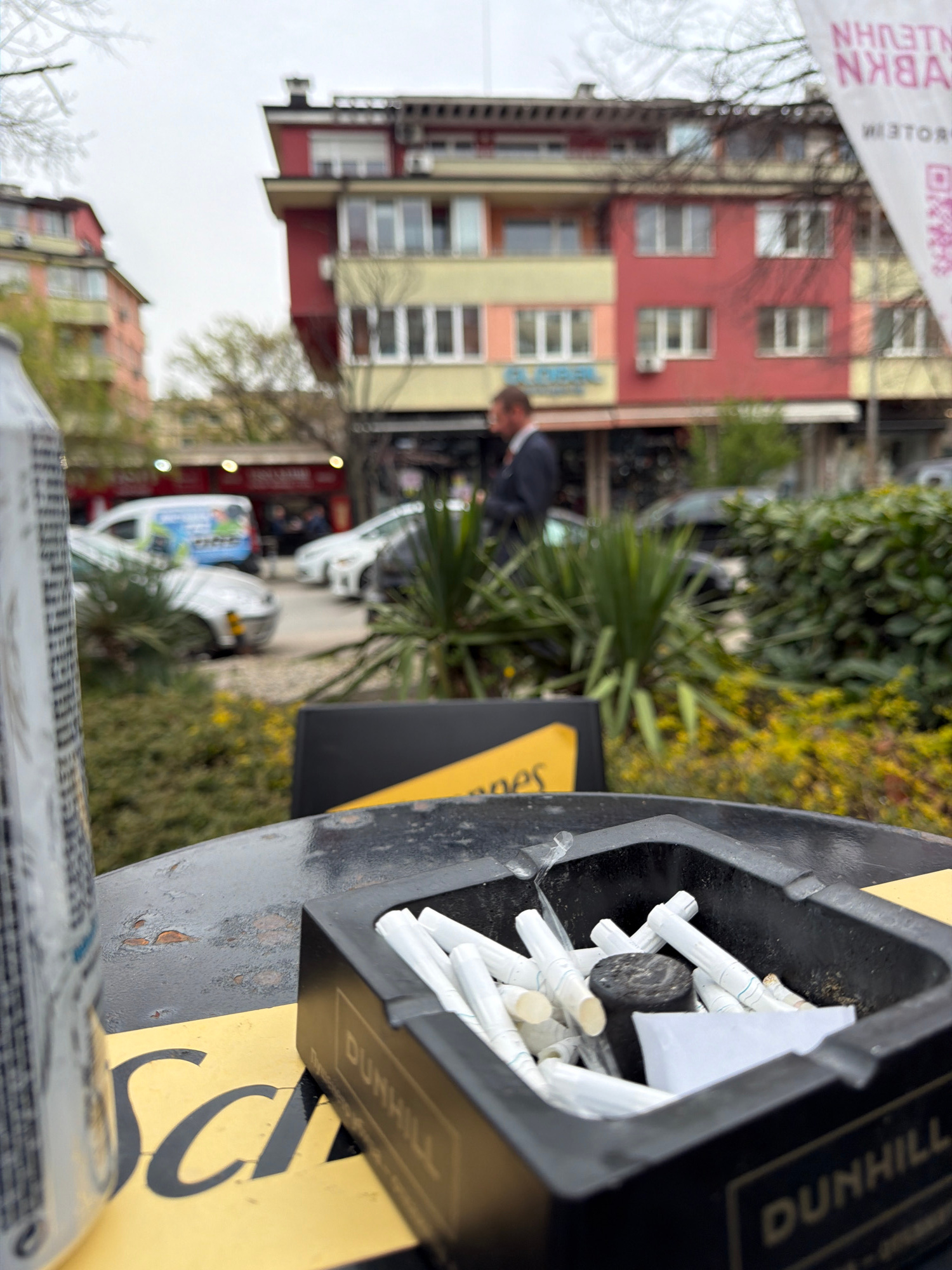 A close-up shot captures a cigarette disposal receptacle, seemingly made by the Dunhill brand, brimming with discarded cigarette butts. The bin is situated on a street in Sofia, Bulgaria. In the backg…read more