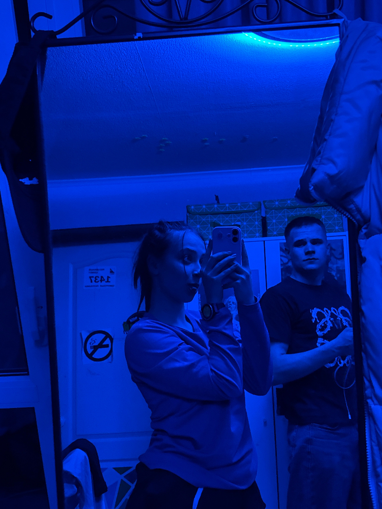 This media file captures a mirror selfie taken indoors, characterized by a dominant blue artificial light source. The image is presented rotated 90 degrees clockwise from its original capture orientat…read more