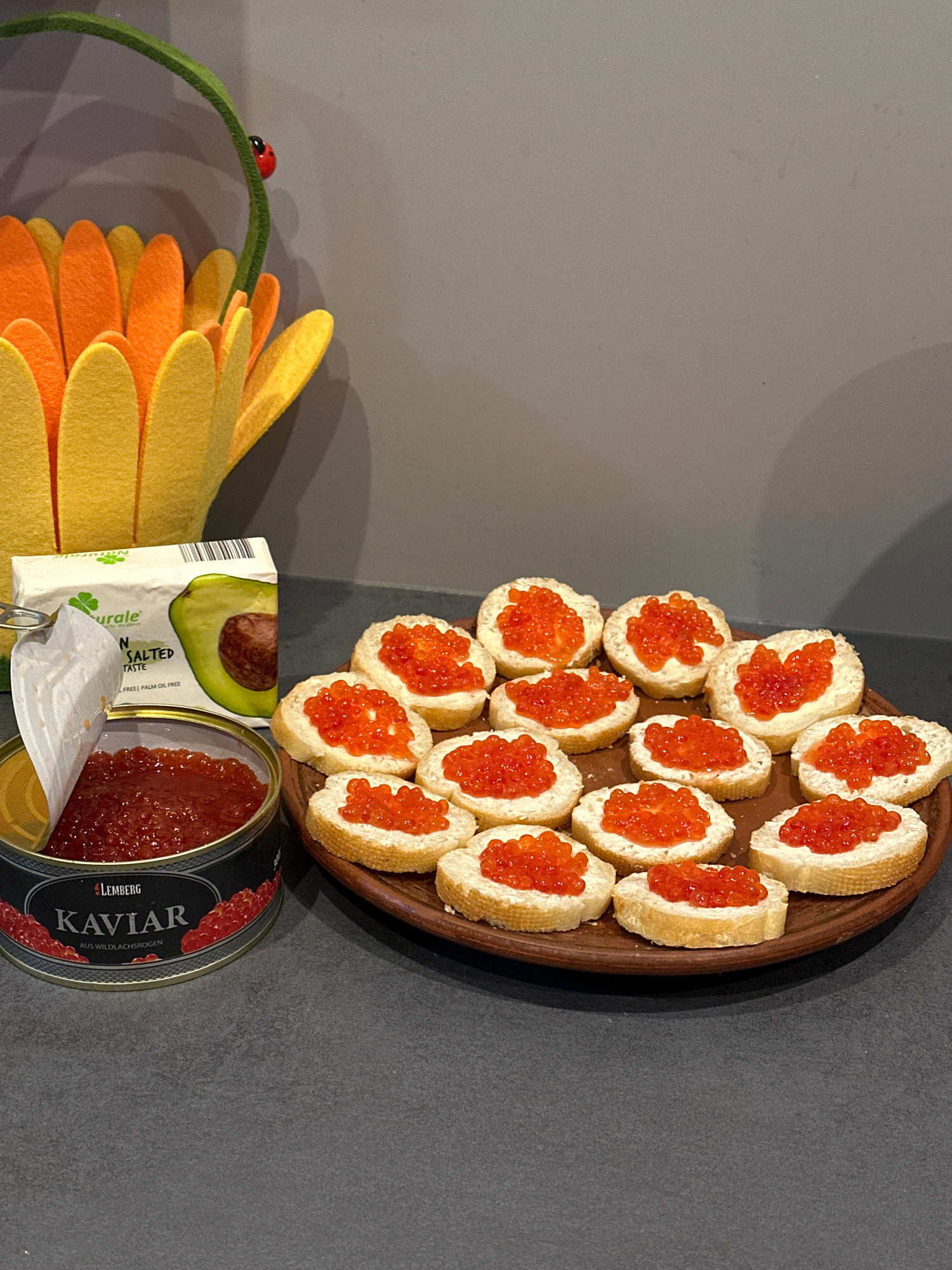 The image shows a still life arrangement of food items and a decorative item on a gray surface. The dominant feature is a brown plate laden with approximately 15 small pieces of bread topped with a wh…read more
