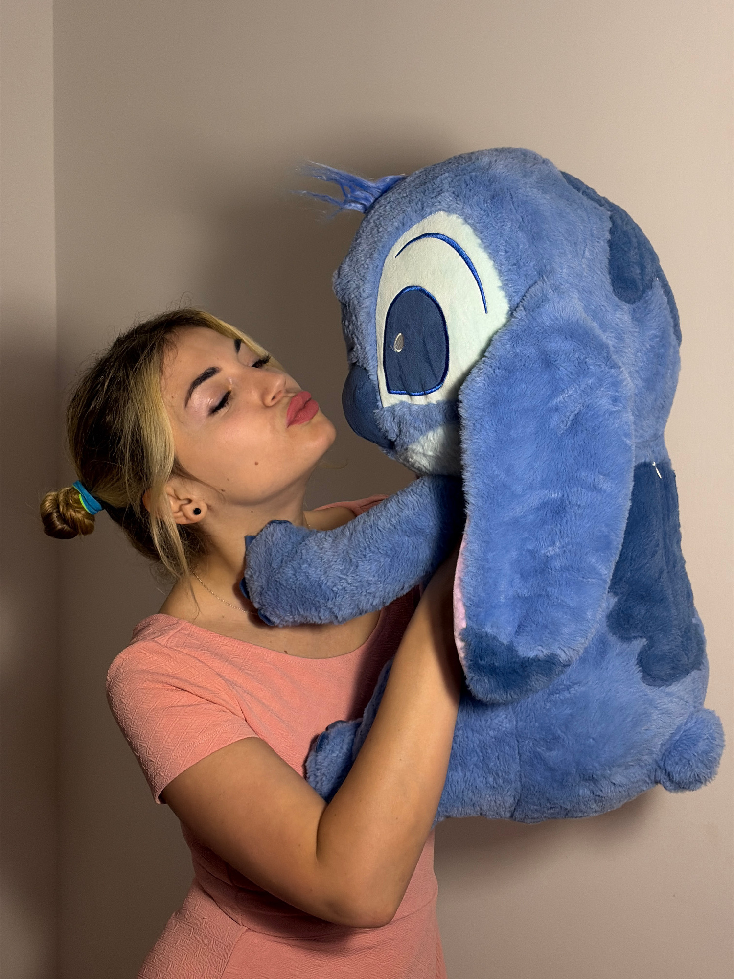 An image, rotated 90 degrees clockwise, captures a young woman affectionately holding a large blue plush toy resembling Disney's Stitch. The woman, positioned towards the right side of the frame, has…read more