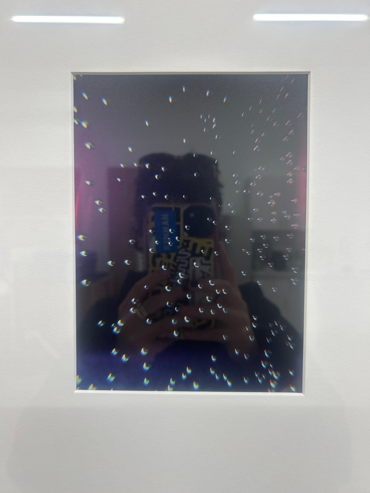 A rectangular framed image shows a photograph of a person holding a phone. The phone reflects the person's face and clothing. The photograph contains small, distorted, colored reflections. The framed…read more