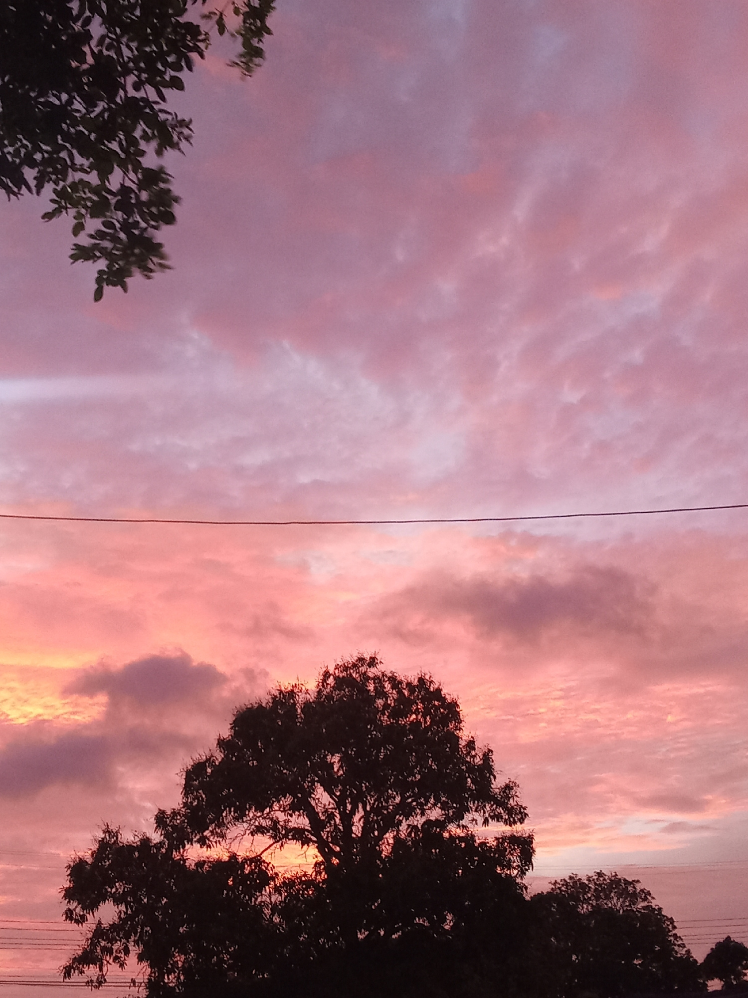 The image captures a vibrant sunset in Juan Griego, Venezuela. The sky is filled with pink and lavender clouds, with a visible horizon line. A dark silhouette of a large tree occupies the lower center…read more