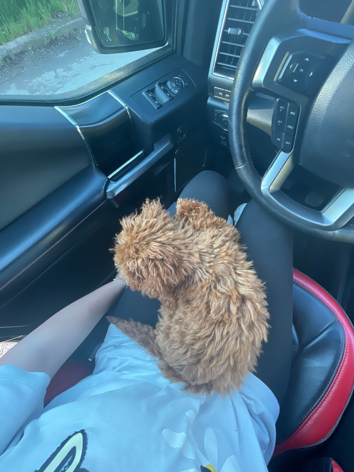 A reddish-brown, medium-sized, curly-haired dog sits in the lap of a person in the driver's seat of a car. The person is wearing black leggings and a white short-sleeved shirt. The car interior is pri…read more