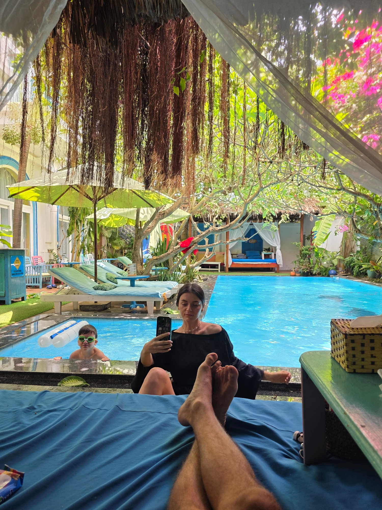 The image captures a scene at the Sailing Club Mui Ne in Mũi Né, Vietnam. A woman is seated, holding a smartphone, seemingly taking a picture or using it near a bright blue swimming pool. A child wear…read more