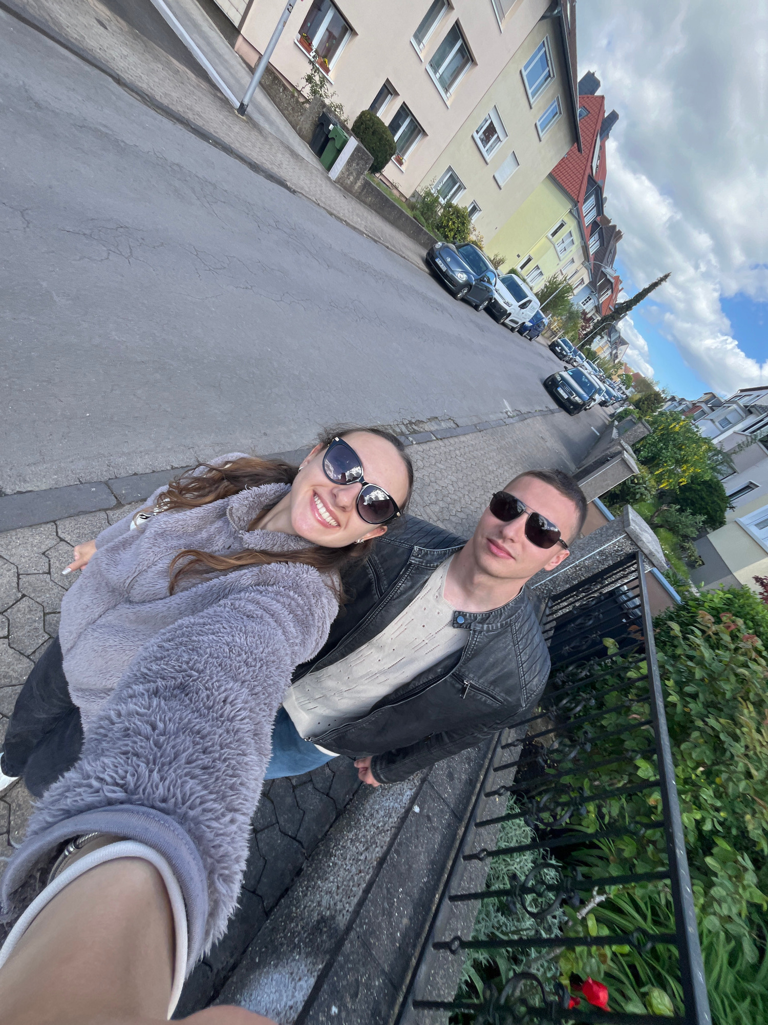 A medium-angle shot depicts two individuals in an urban setting, specifically on a street in Saarbrücken, Germany. The foreground features a woman with long brown hair, wearing a gray fleece jacket a…read more