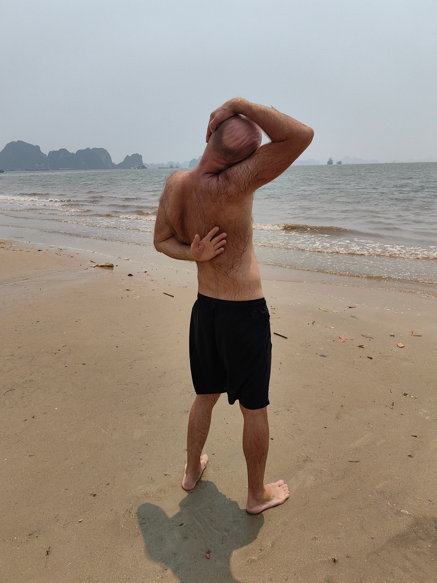 A man stands on a sandy beach facing away from the camera. He has his right hand on his head and his left arm bent backwards with his hand on his back. He is wearing black shorts. The beach stretches…read more