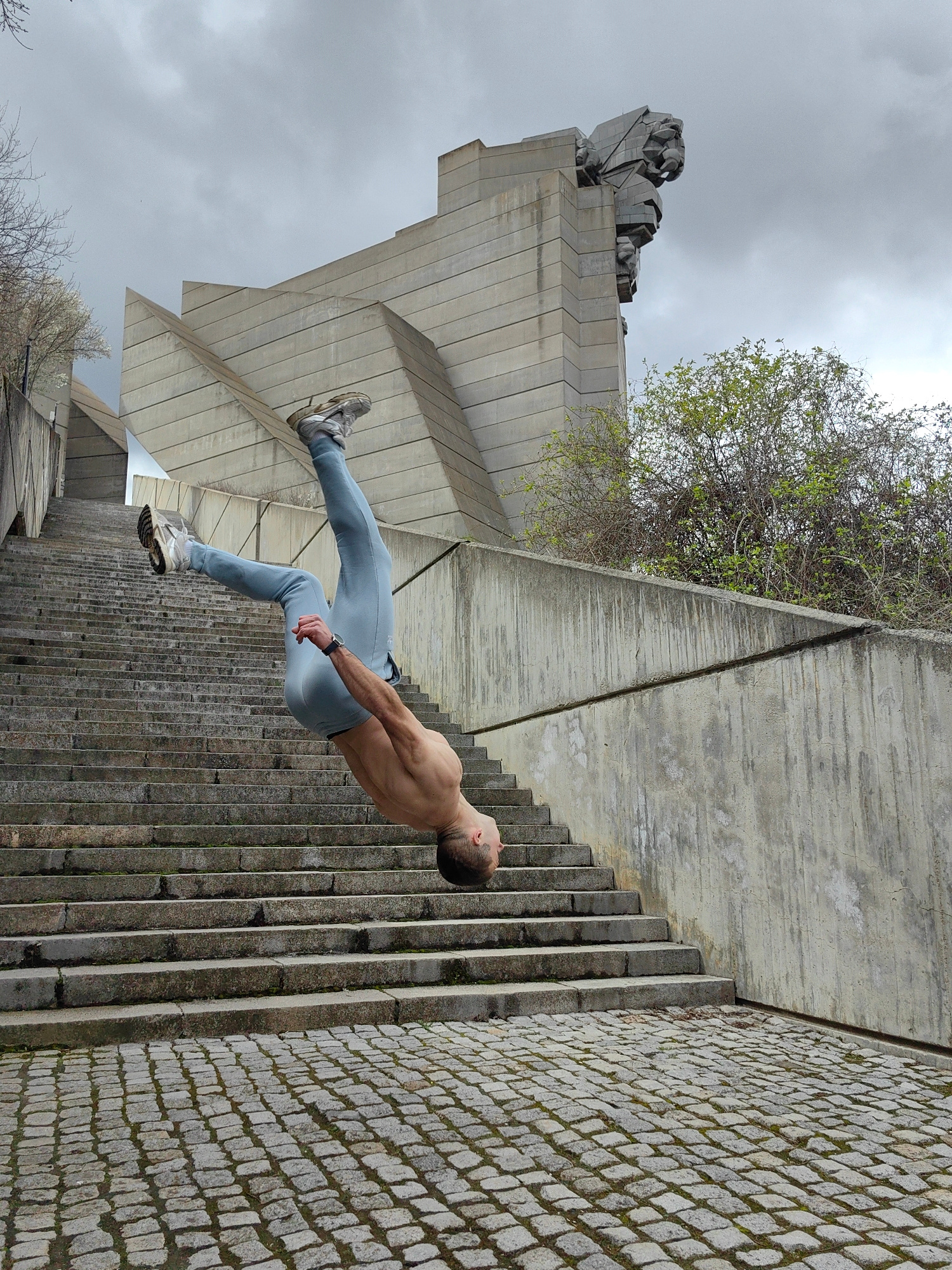 A man performs a backflip on a set of stone stairs in Shumen, Bulgaria, against the backdrop of the Founders of the Bulgarian State Monument. The man, shirtless and wearing light blue pants and sneake…read more