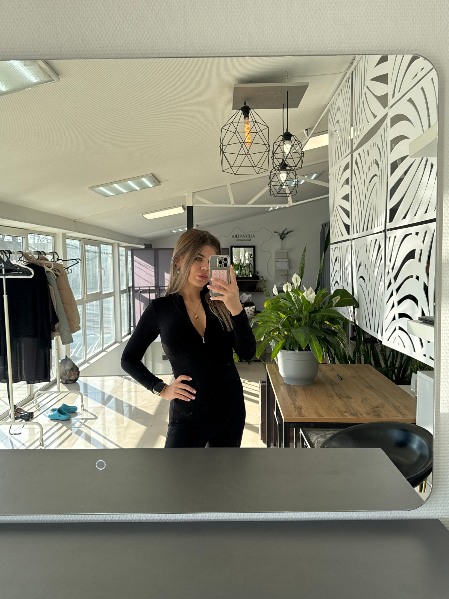 The image, originally rotated 90 degrees counter-clockwise, presents a mirror selfie taken by a woman in a bright, modern interior. A young woman with long, light-colored hair, dressed in a black long…read more