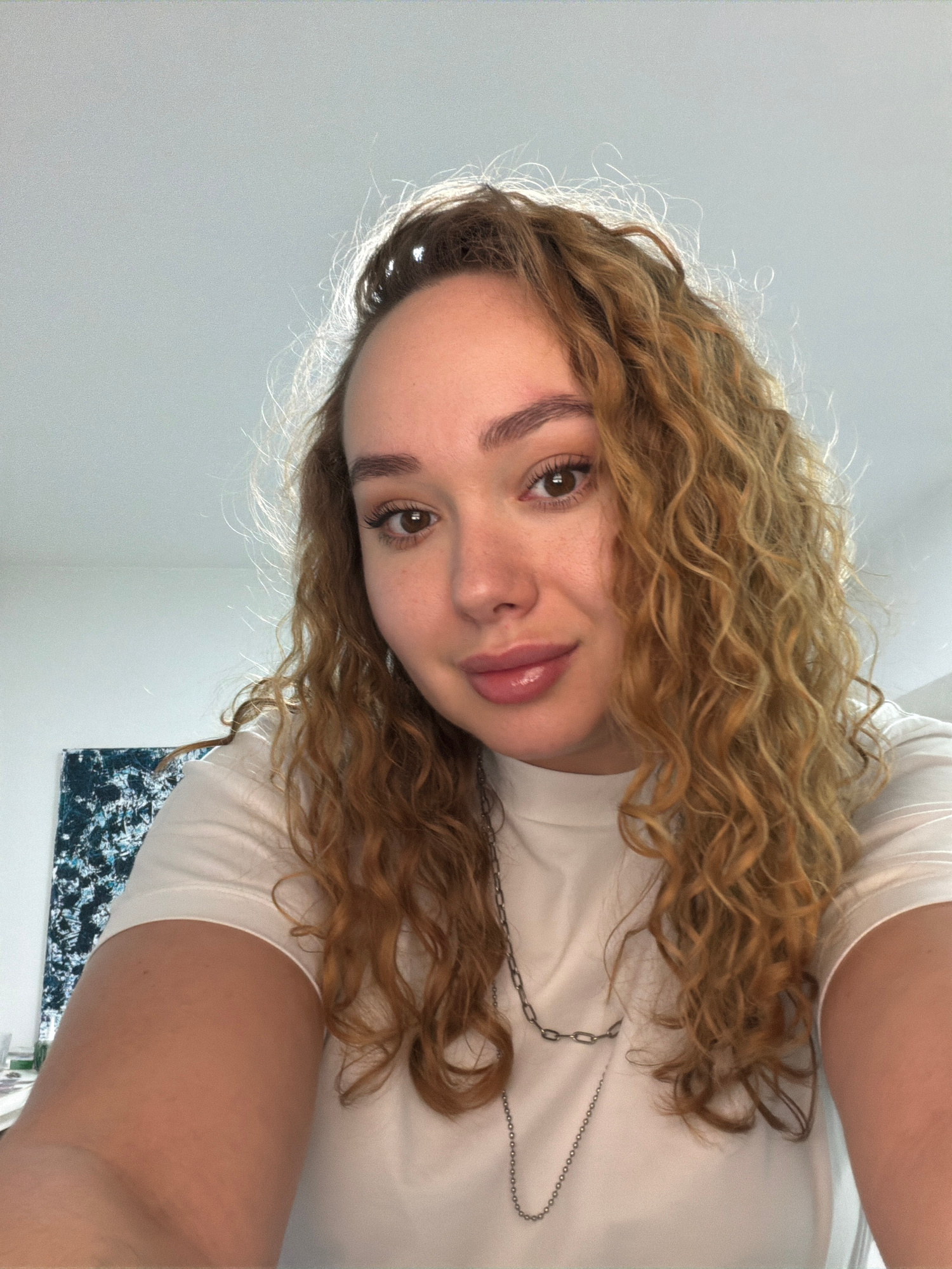 A young woman with curly, light brown hair is positioned close to the camera. She has fair skin, dark eyebrows, brown eyes, and pink lips. She wears a white t-shirt and a silver necklace. The backgrou…read more