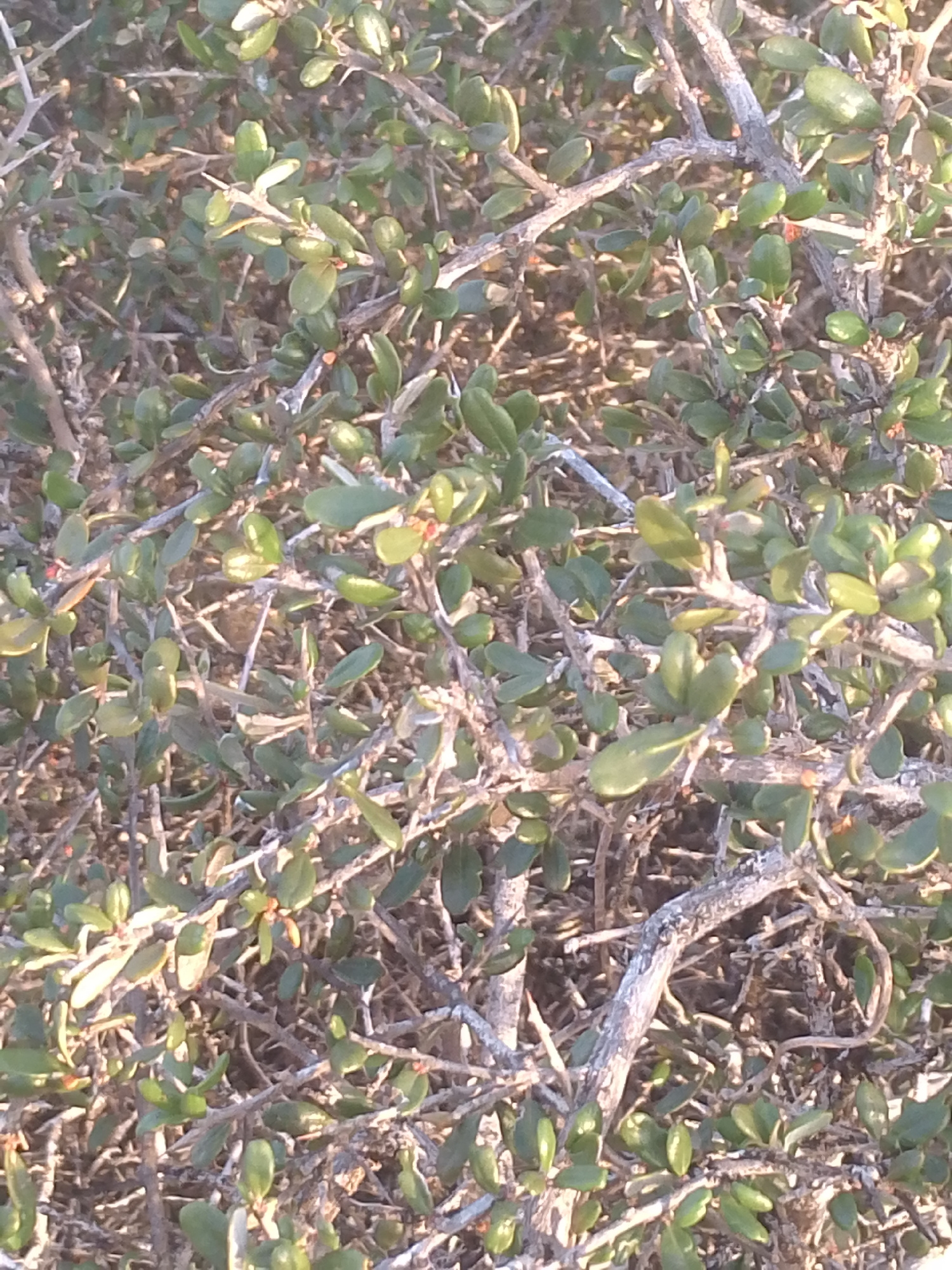 The image depicts a dense shrub with small, rounded green leaves and thin, grayish-brown branches. The shrub appears to be growing in a natural environment. The details provided do not enable forensic determination of the location in Juan Griego, Venezuela. | Open Wire