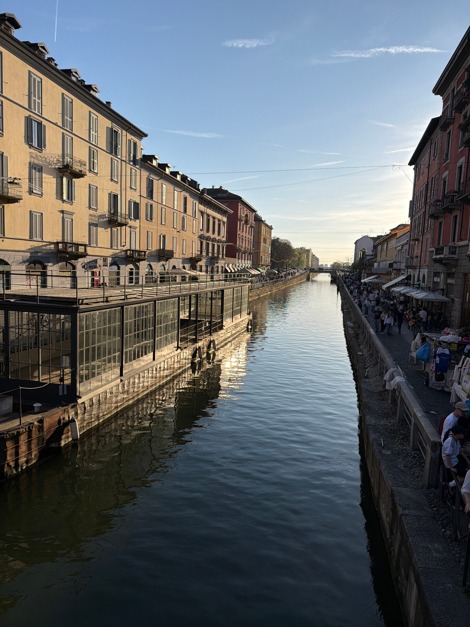 The image captures a canal scene in Milan, Italy. The waterway stretches into the distance, flanked by buildings on either side. The water reflects the surrounding structures and sunlight. On one bank…read more