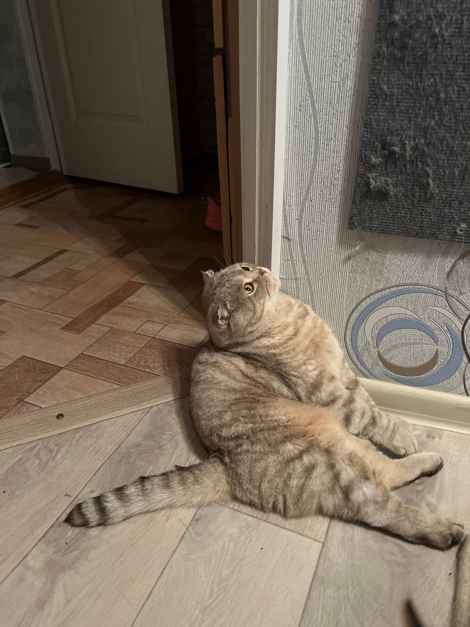 A tan tabby cat lies on its back on a wood-patterned floor, looking up and to the left. The floor is arranged in alternating patterns of lighter and darker wood grain. Part of a white door is visible…read more