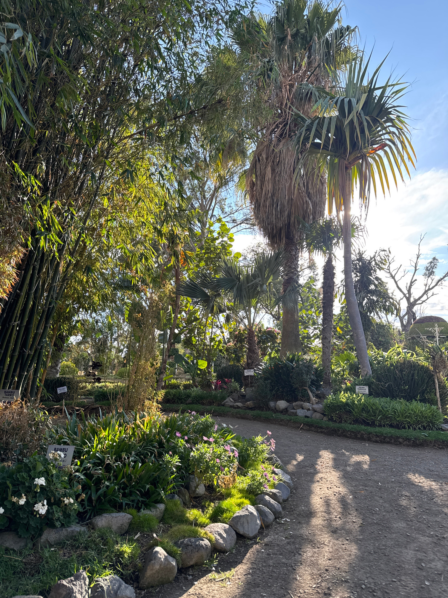 The image depicts a botanical garden pathway in Santa Ana Yancuitlalpan (Chilhuacán), Mexico. The path, composed of packed dirt, is flanked by dense vegetation. On the left, stands of bamboo grow tall…read more