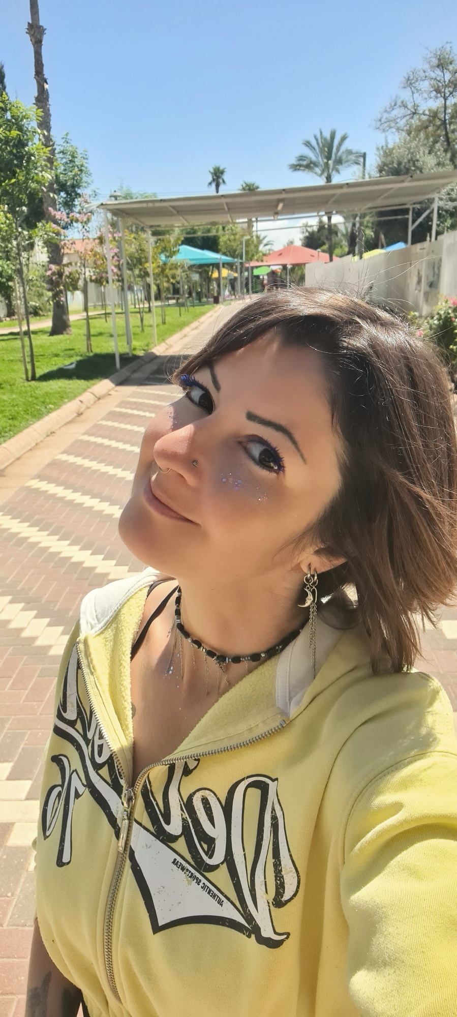 A medium shot shows a woman wearing a yellow zip-up hoodie and a black necklace, and she is facing the camera. She has brown hair and blue glitter on her face, and she is standing on a brick pathway.…read more