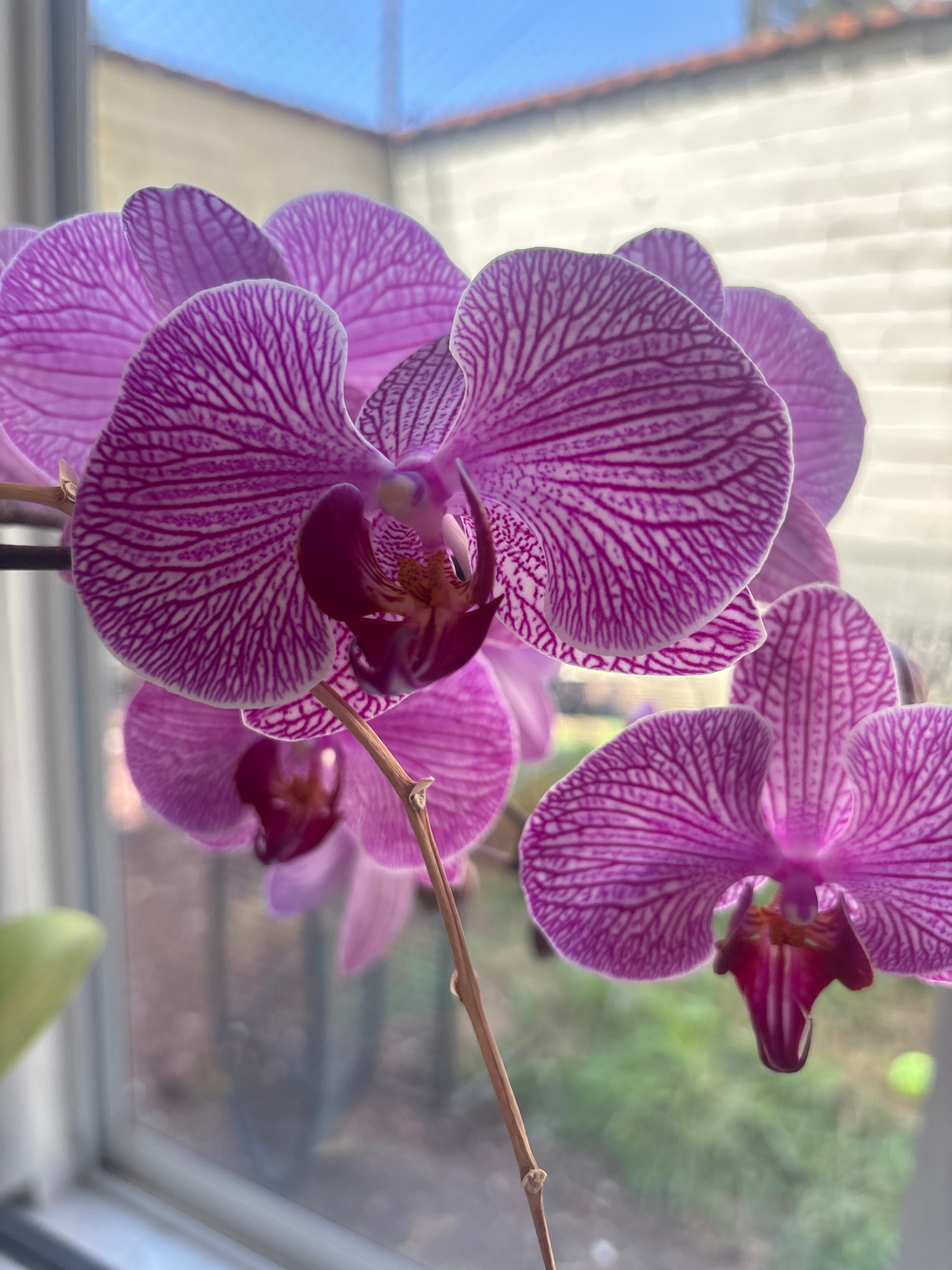 A close-up shot focuses on a cluster of purple orchid flowers, their petals intricately lined with darker purple veins. A bare, brown stem extends among the blossoms. The backdrop consists of a window…read more