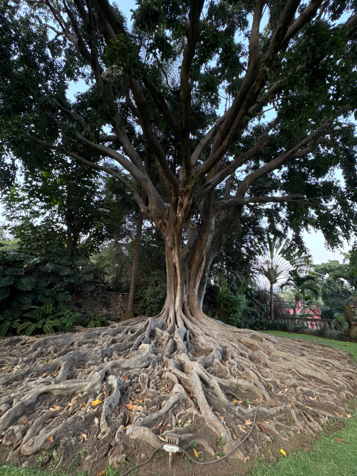 A large tree dominates the frame, showcasing an extensive root system prominently displayed above ground. The thick, intertwining roots spread widely across the ground, contrasting with the smooth bra…read more