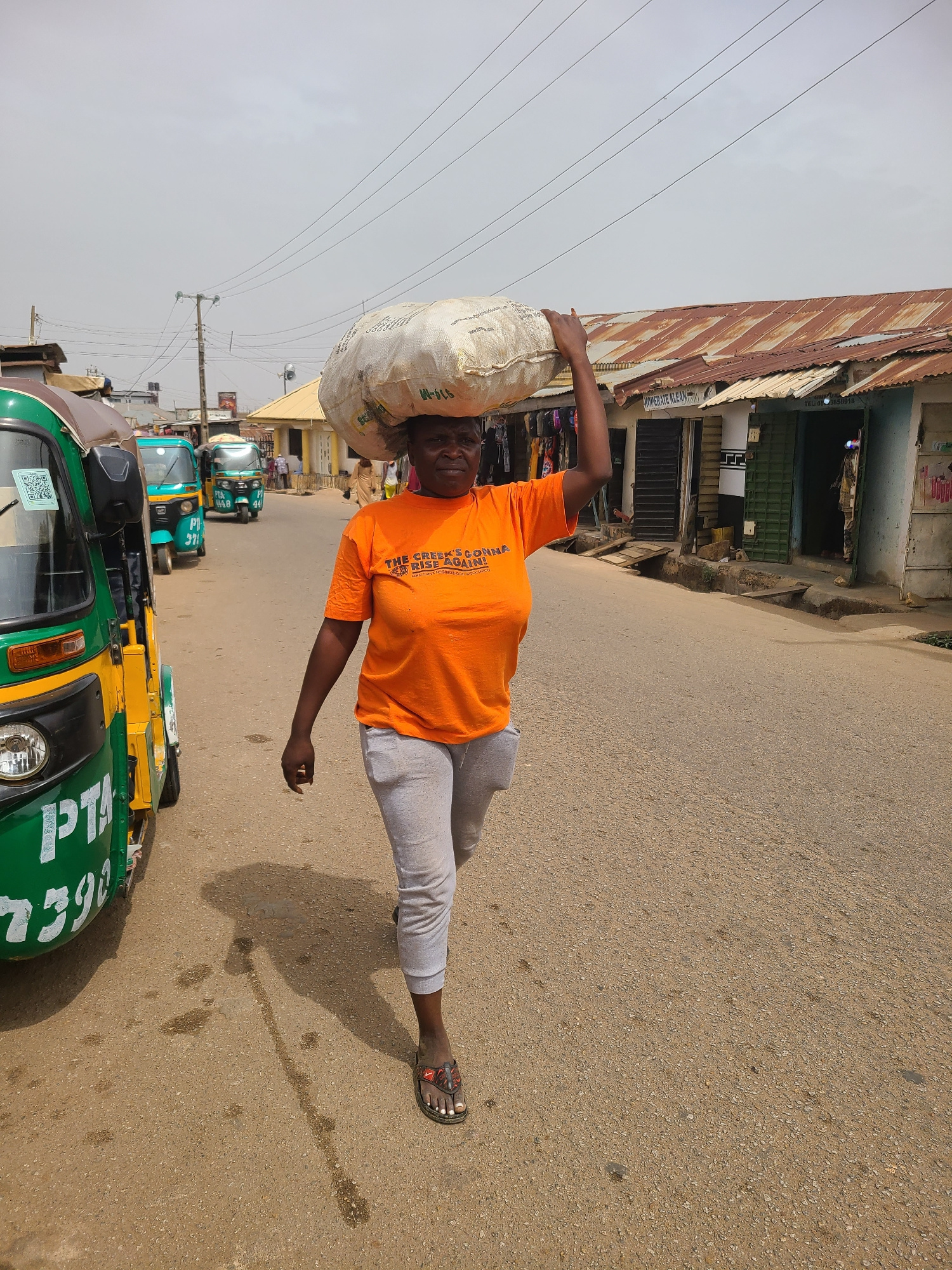 A man in Jos, Nigeria, carries a large, white sack on his head while walking on a paved road. He is wearing an orange t-shirt with text, grey pants, and sandals. In the background are shops and green…read more