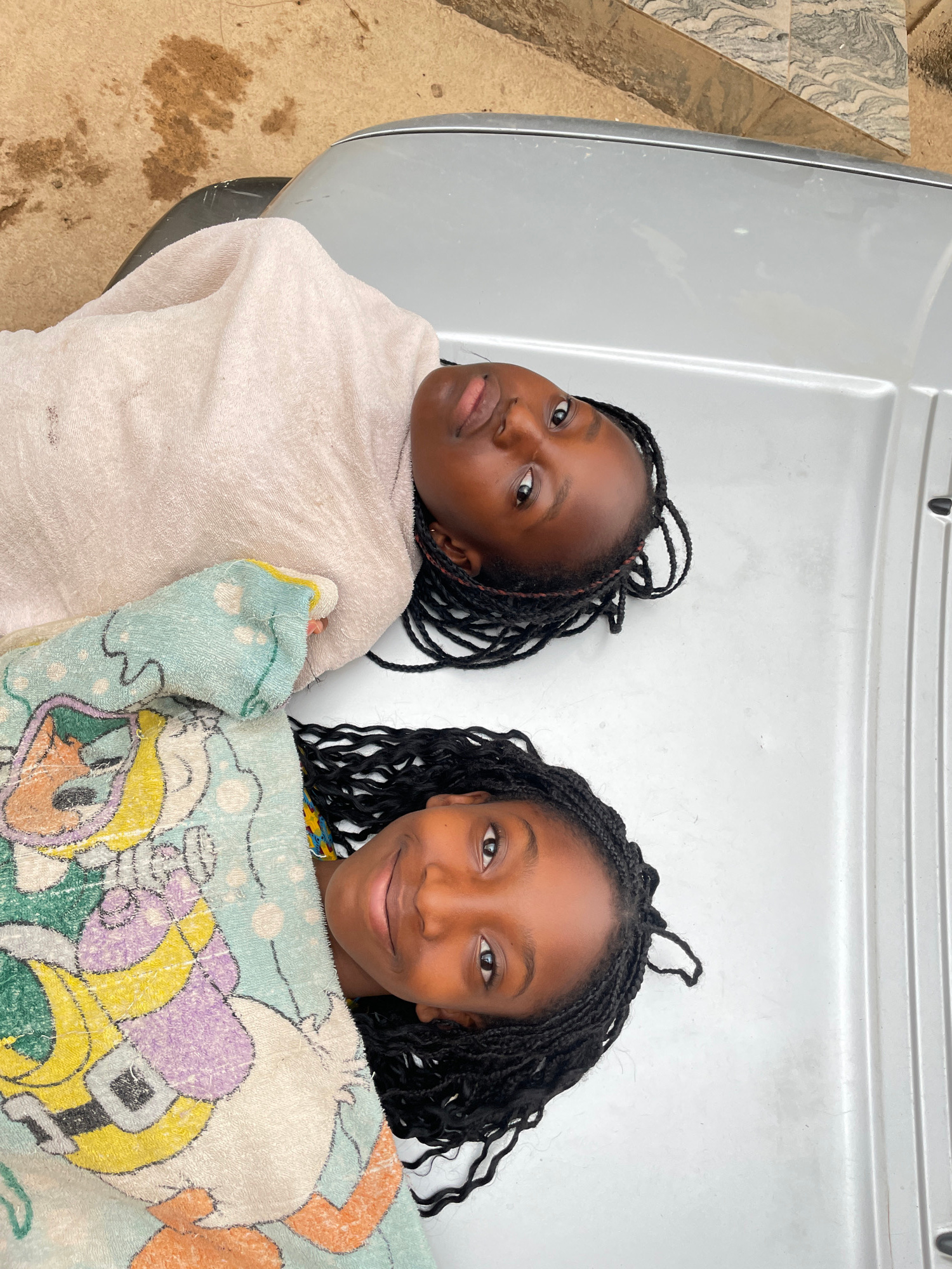 Two young, dark-skinned girls lie on the hood of a silver car. The girl on the left is wrapped in a white towel, while the girl on the right is covered with a blue and yellow cartoon-patterned towel.…read more