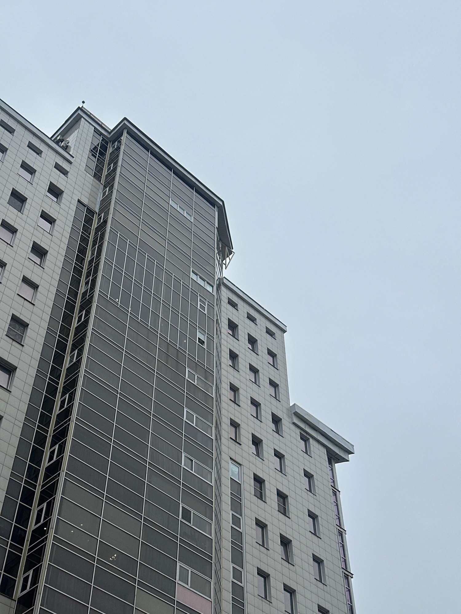 The image depicts the exterior of a modern building in Perm, Russia. The building features a mix of architectural styles, including a section with large, grid-patterned windows and another part with s…read more