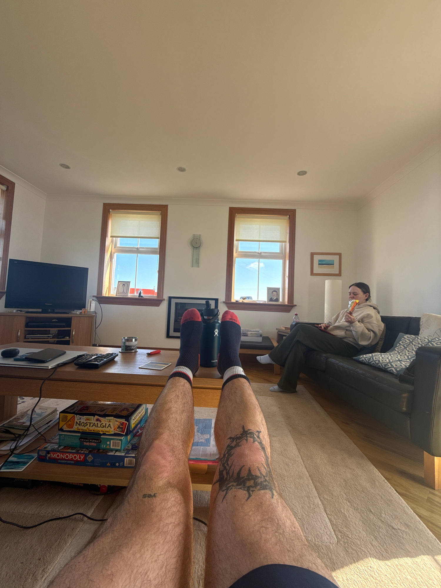 The interior of a living room is depicted in a high-angle, eye-level shot. A person is seated on a dark-colored sofa, eating something from a package. A table, partially visible in the foreground, hol…read more