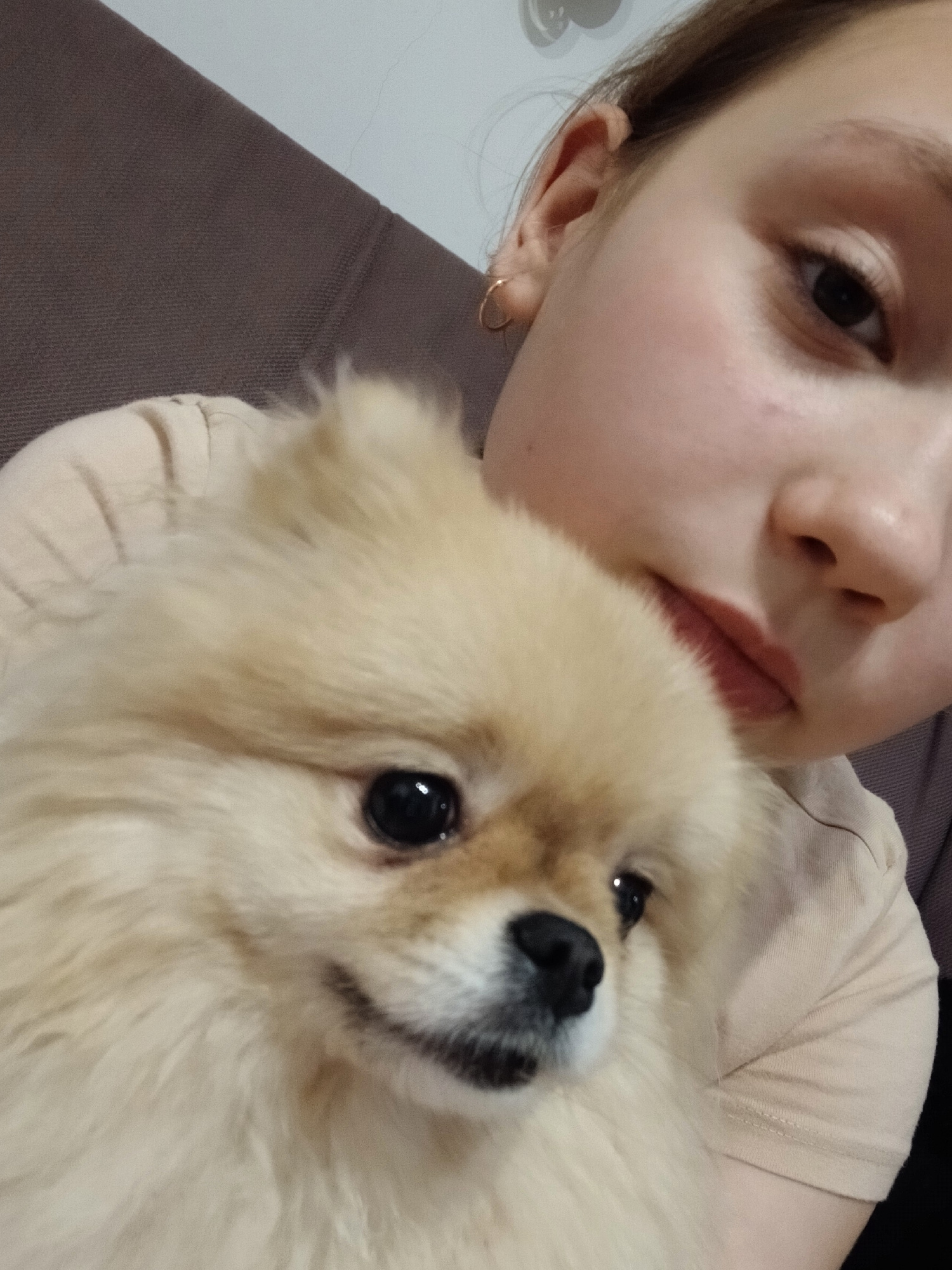 A close-up shot features a young woman and a Pomeranian dog. The woman's face is partially visible, revealing a brown eye, fair skin, and a gold hoop earring. Her lips are pressed slightly together. Sβ¦read more