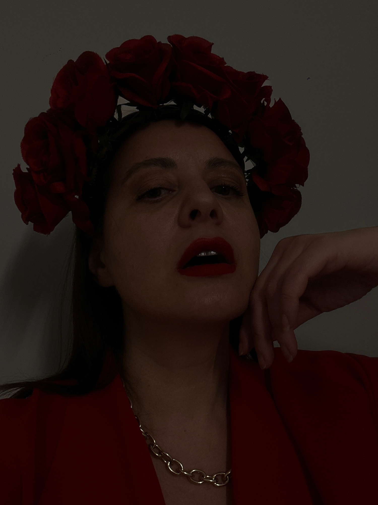 A woman with a red rose wreath around her head is lying down. She is wearing red lipstick and a red dress. A gold chain necklace is visible on her neck. Her hand is resting near her face. The backgrou…read more