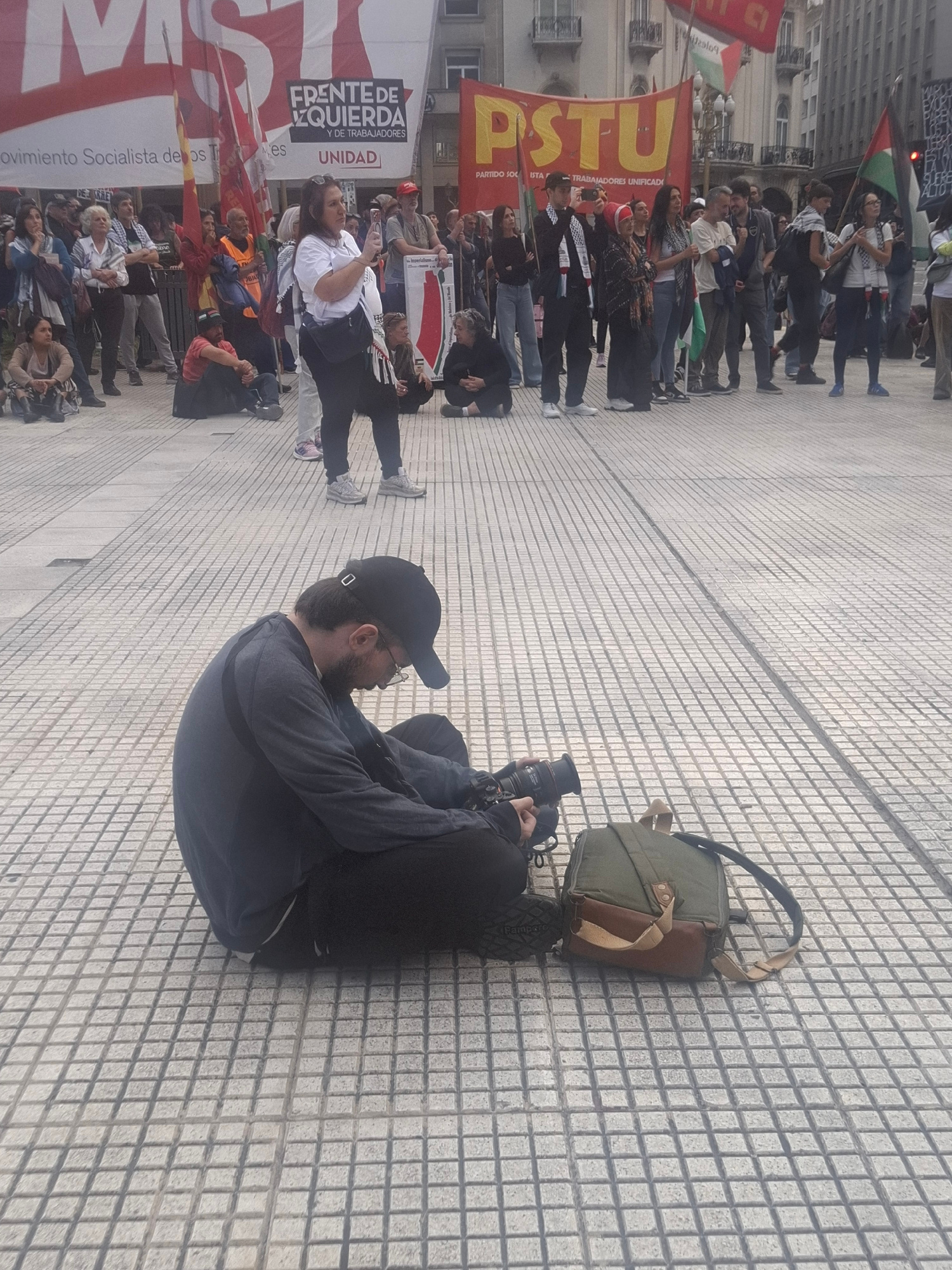 Here's a description of the scene: The image shows a political protest taking place in Buenos Aires, Argentina. A crowd of people is gathered, holding banners and flags with socialist and leftist slo…read more