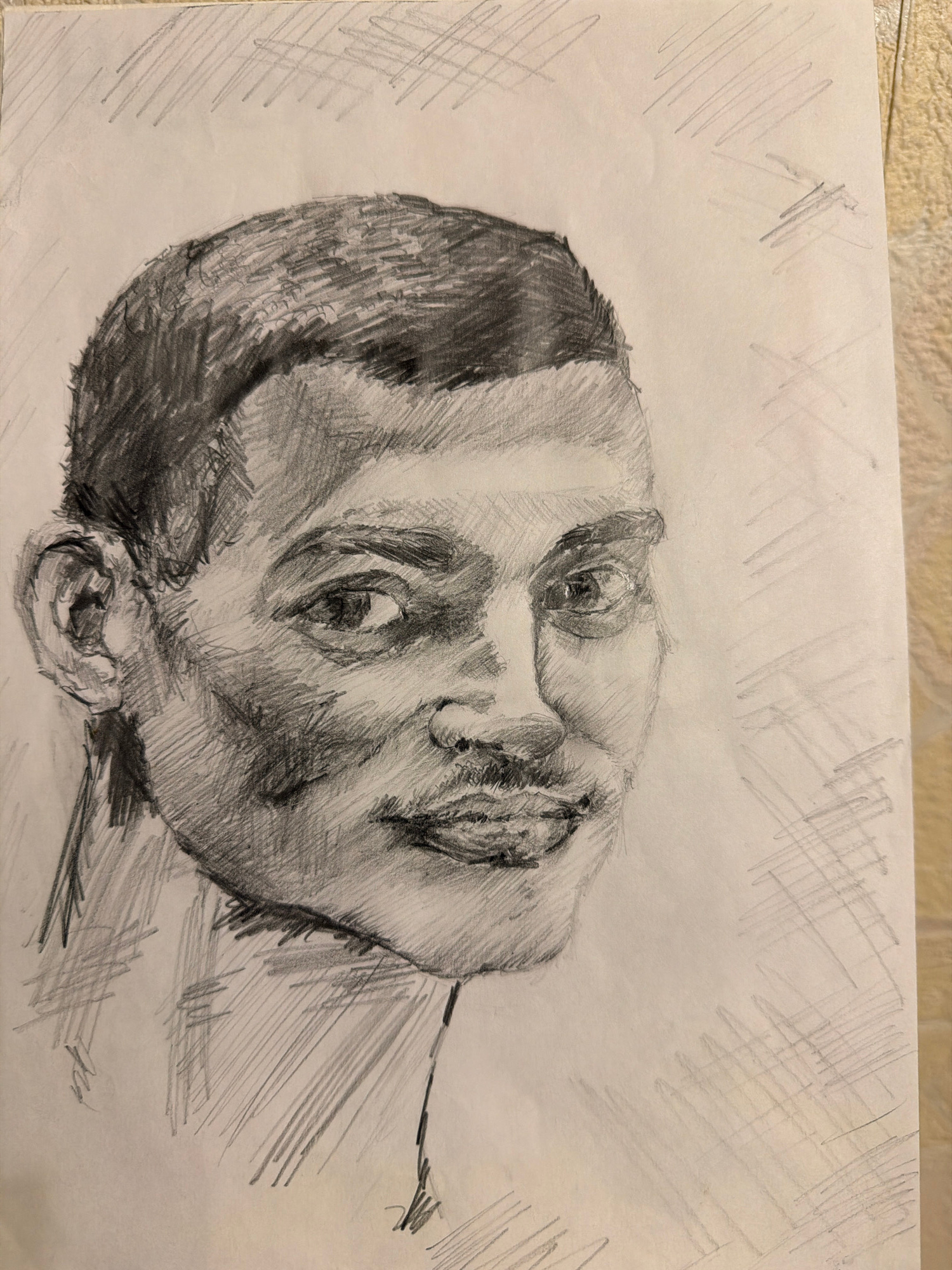 The image is a pencil sketch of a human face. The face is depicted at an unusual, slightly angled, perspective with the subject looking upwards. The shading suggests depth and dimension to the facial…read more