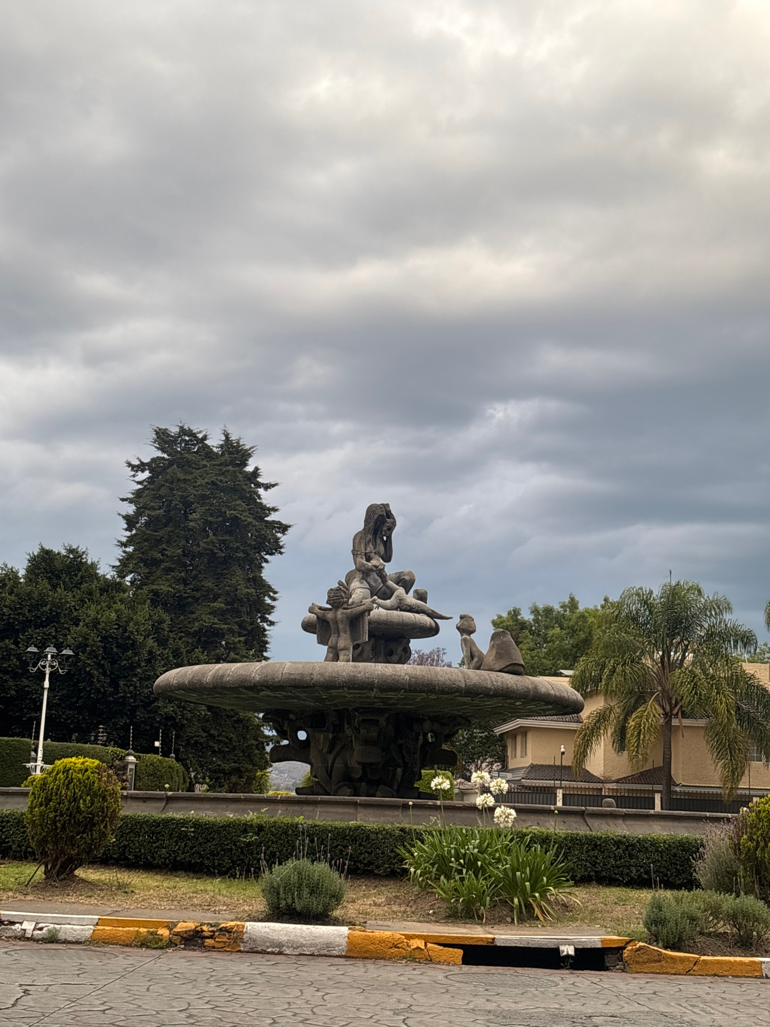 The image captures a monumental stone fountain in Huixquilucan de Degollado, Mexico, against a cloudy sky. The fountain, adorned with sculpted figures, stands prominently in a landscaped area with var…read more