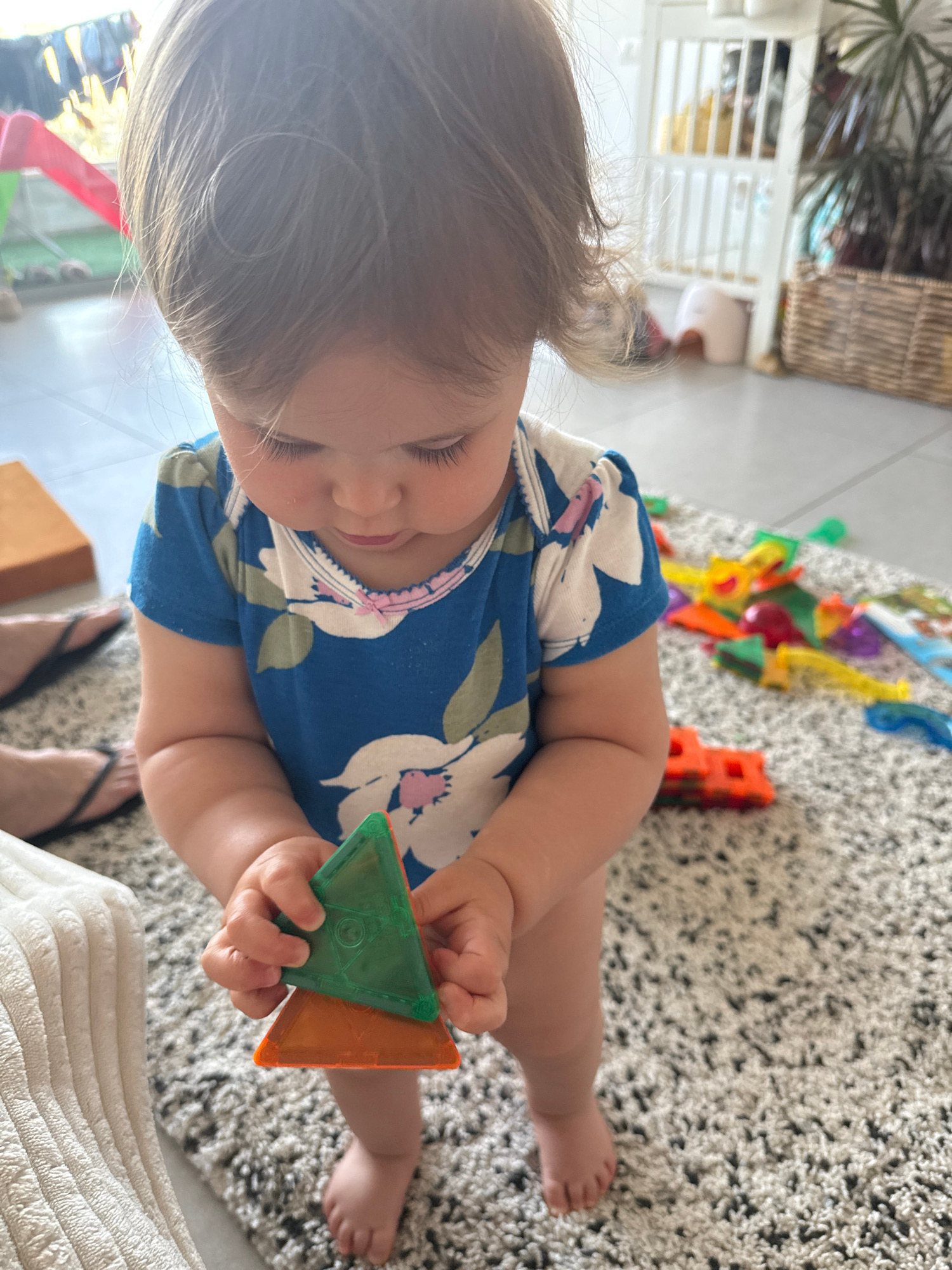 This high-angle, indoor shot captures a baby or young toddler playing on a light-colored, shaggy rug in a home in Ramat Gan, Israel. The baby, with light brown hair, is wearing a blue short-sleeved on…read more