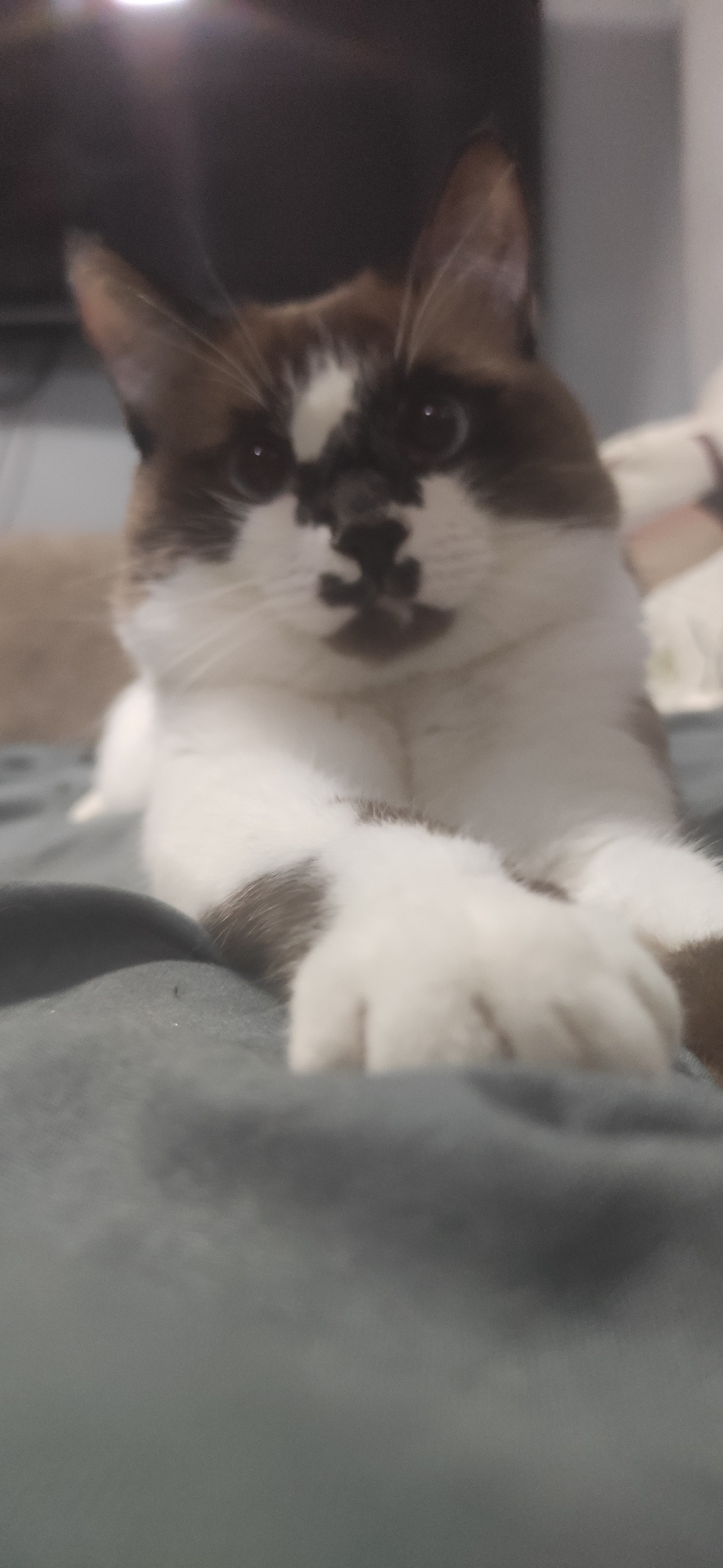 A white and brown cat is clinging to the side of a grey couch. The cat has a blotched brown and black pattern on its face. The background is blurry, showing a wall. The location is unknown and there's…read more
