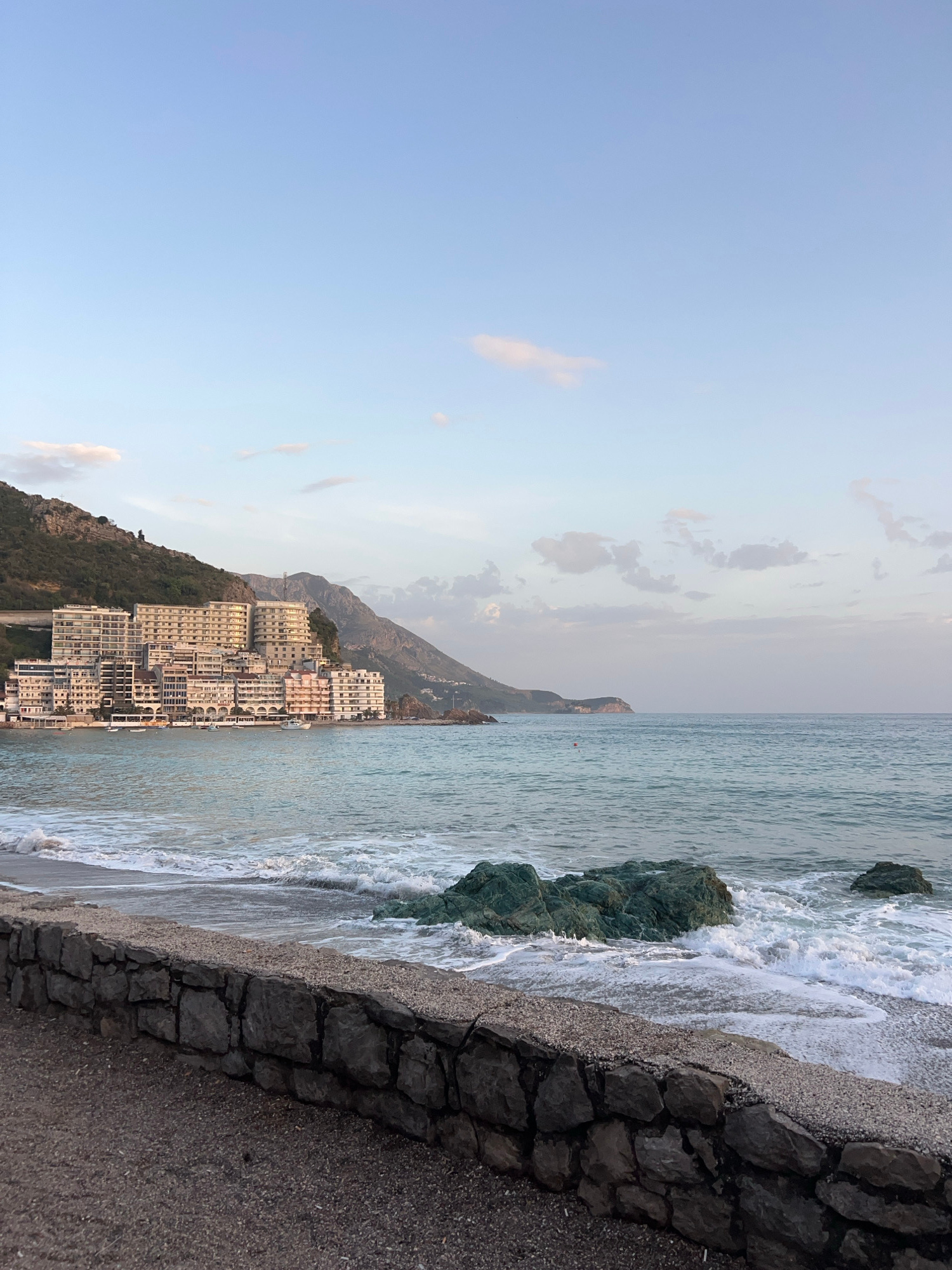 The image captures a coastal scene in Rafailovići, Montenegro, displaying a view of the town's buildings stretching along the coastline, nestled at the base of a mountain. The sky is partially cloudy…read more