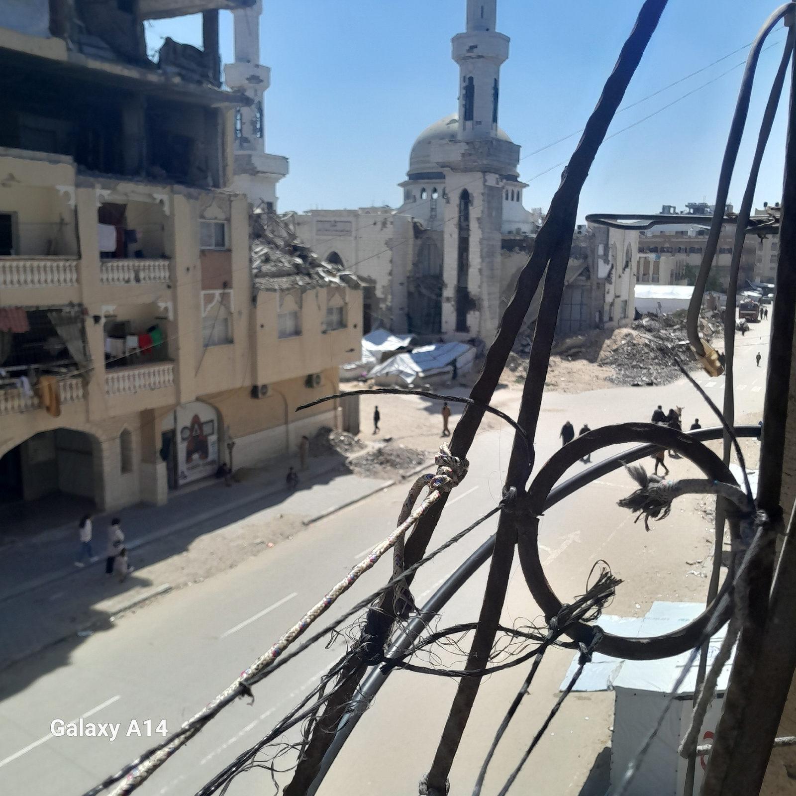 The image depicts a cityscape in Khan Yunis, Palestinian Territory, heavily marked by destruction. A mosque with a minaret stands amidst the rubble. Adjacent buildings exhibit significant damage, incl…read more