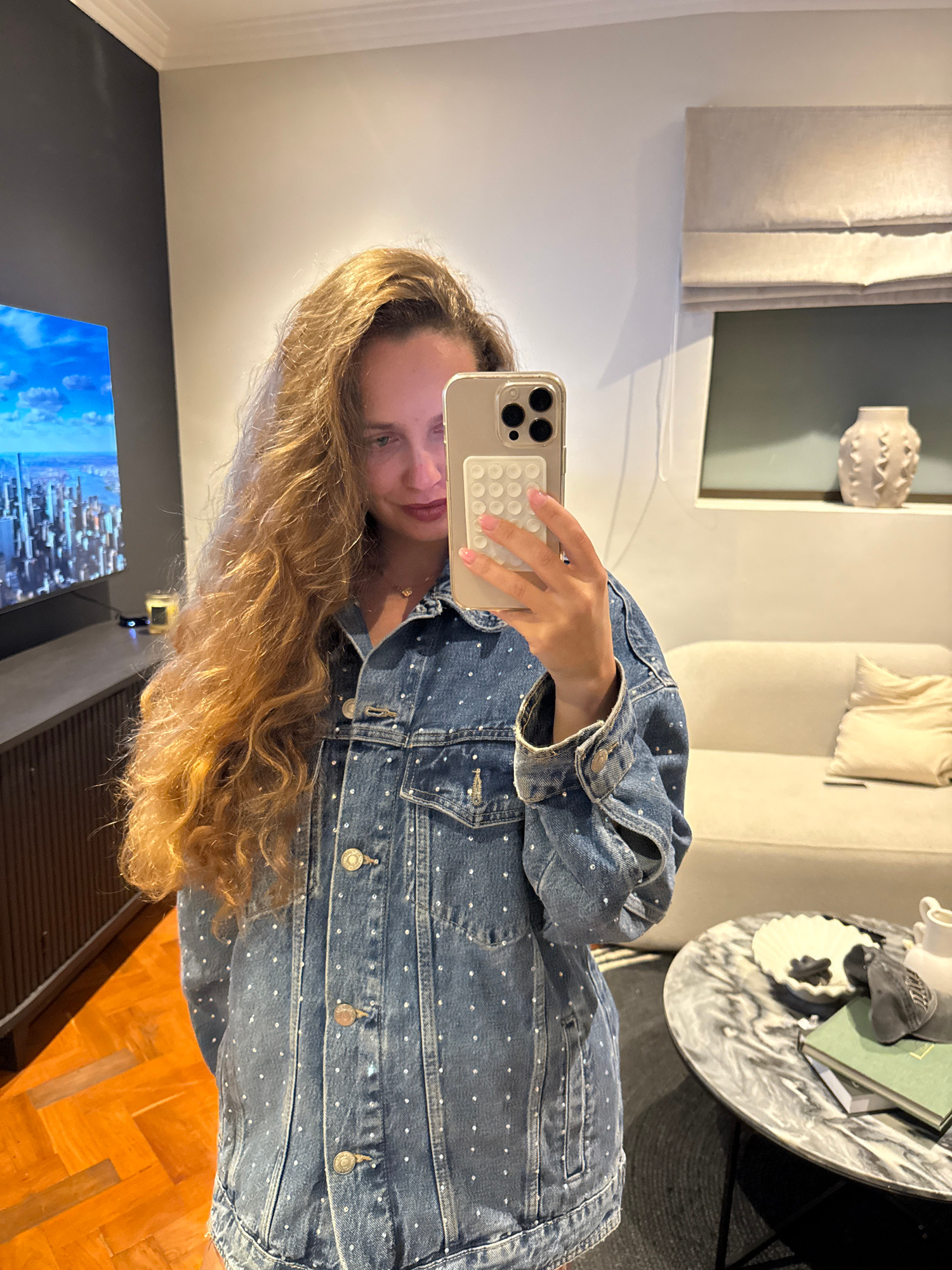 A young woman with long, blonde hair is taking a selfie. She is wearing a blue denim jacket with white polka dots. She is holding a gold iPhone with a white pop-it case. The background shows a living…read more