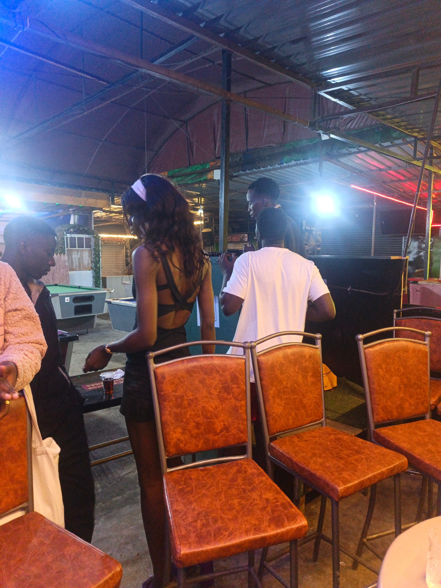 This nighttime image captures a casual entertainment venue in Nairobi, Kenya, with an exposed roof structure featuring metal beams and a translucent covering. The space is dimly lit but punctuated by…read more