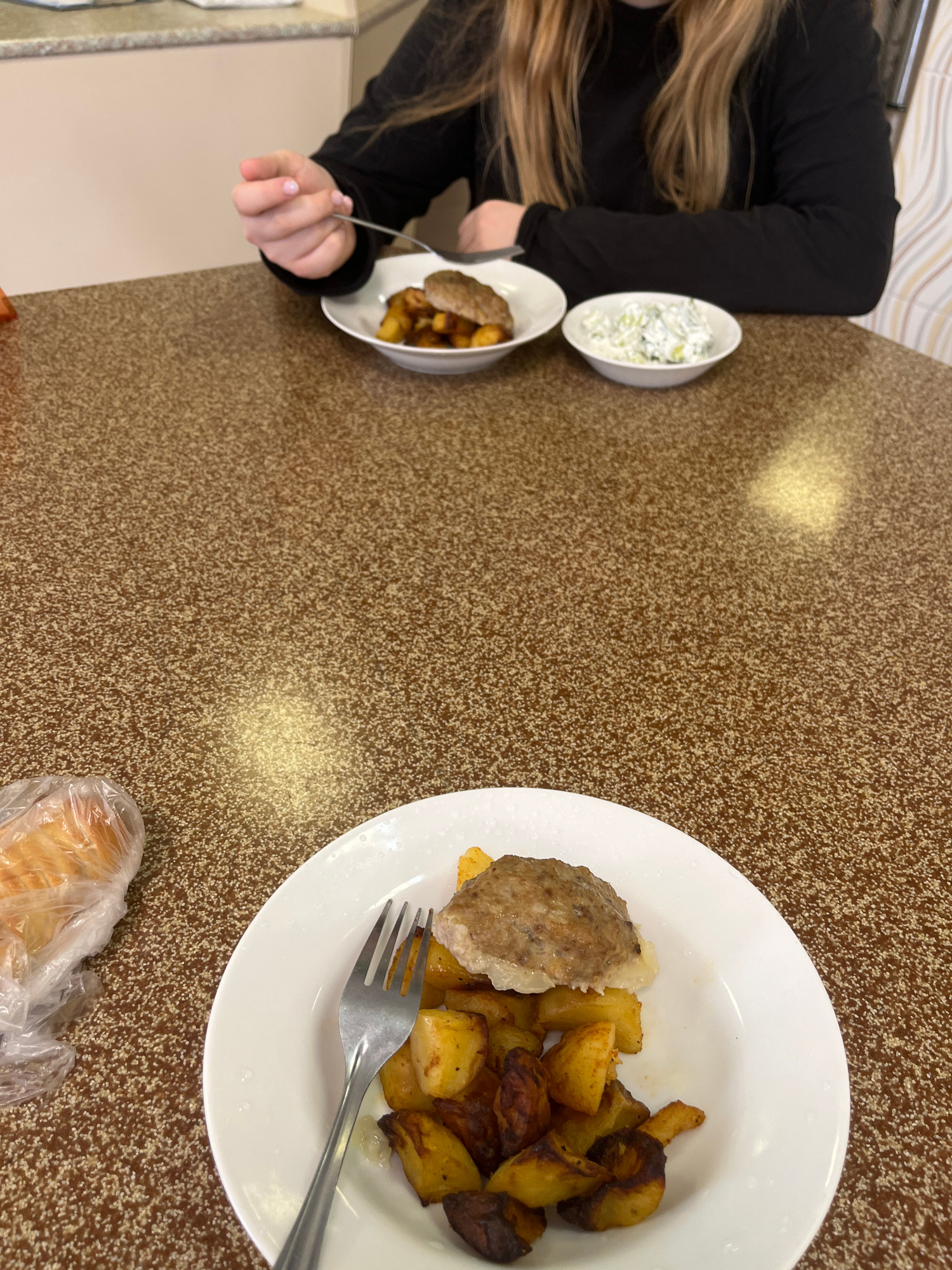 A high-angle indoor shot shows a person sitting at a brown speckled tabletop, with food arranged in two white bowls and on a white plate. The person on the left is partially visible, wearing a black t…read more